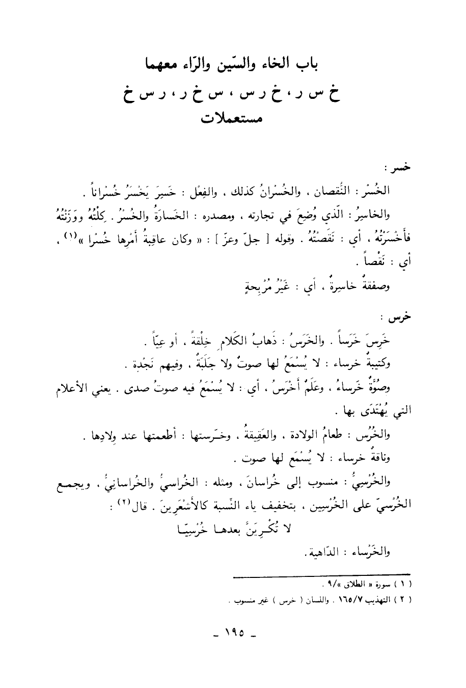 باب الخاء والسين والراء معهما خ س ر، خ ر س، س خ ر، ر س خ مستعملات