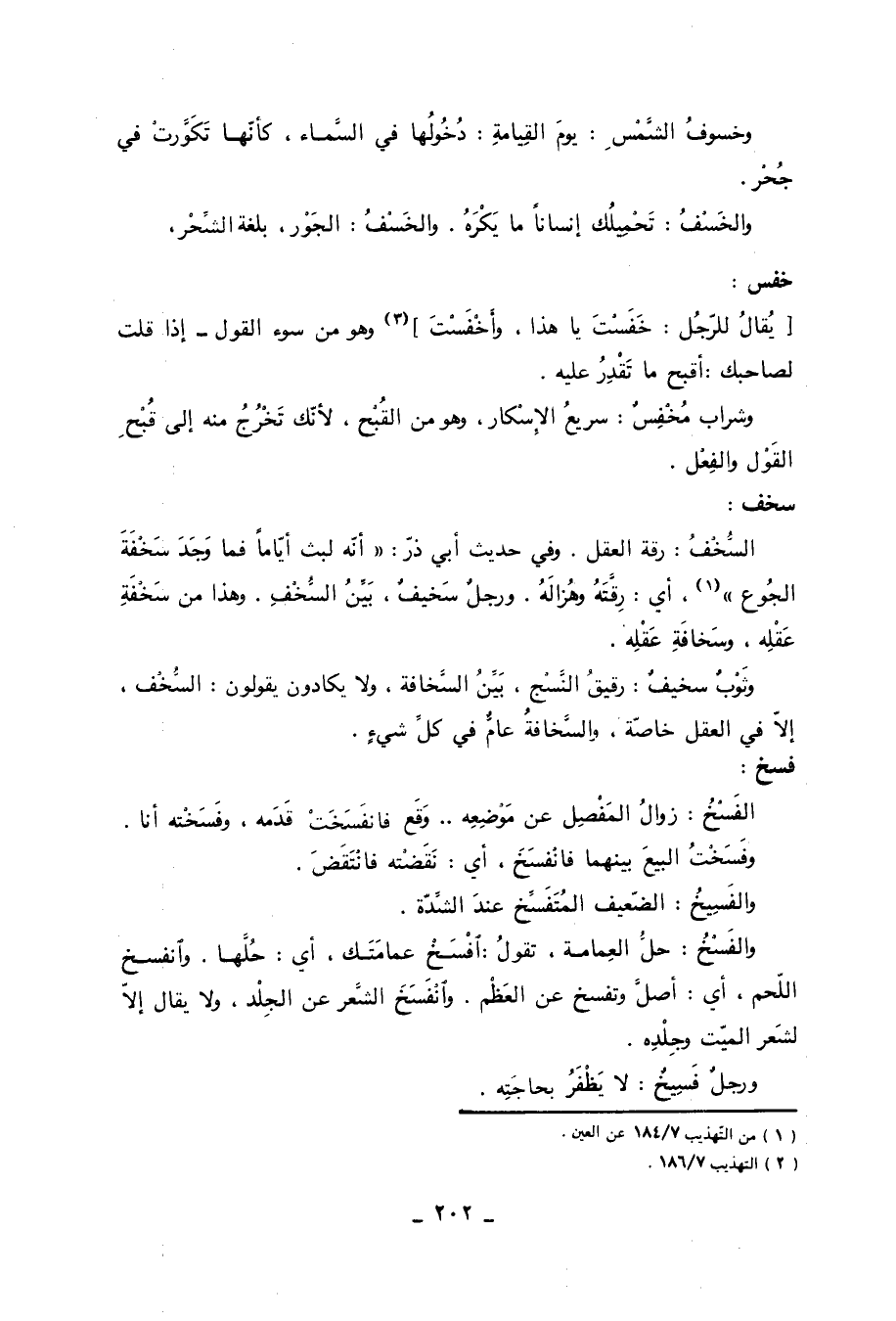 فسخ: الفَسْخُ: زوال المفصل عن موضعه.. وقع فانفَسَخَتْ قدمه، وفَسَخْته أنا. وفَسَخْتُ البيع بينهما فانْفَسَخَ، أي: نقضته فانتقض. والفَسِيخُ: الضعيف المُتَفَسِّخ عند الشدة. والفَسْخُ: حل العمامة، تقول: أفْسَخْ عمامتك، أي: حلها. وانفسخ اللحم، أي: أصل وتفسخ عن العظم. وانْفَسَخَ الشعر عن الجلد، ولا يقال إلا لشعر الميت وجلده ورجل فَسِيخٌ: لا يظفر بحاجته.
