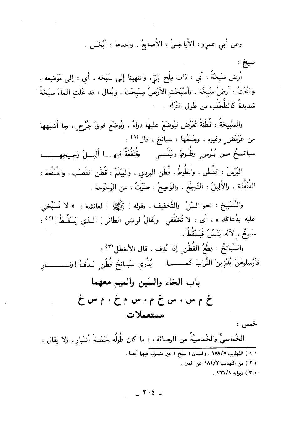 سبخ: أرض سَبِخَةٌ: أي: ذات ملح ونزٍ، وانتهينا إلى سَبَخه، أي: إلى موضعه، والنعت: أرض سَبِخَة. وأَسْبَخَتِ الأرض وسَبِخَتْ. ويقال: قد علت الماء سَبَخَةٌ شديدة كالطحلب من طول الترك. والسَّبِيخةُ: قطنة تعرض ليوضع عليها دواء، وتوضع فوق جرحٍ، وما أشبهها من عرمضٍ وغيره، وجمعها: سبائخ، قال «1» :