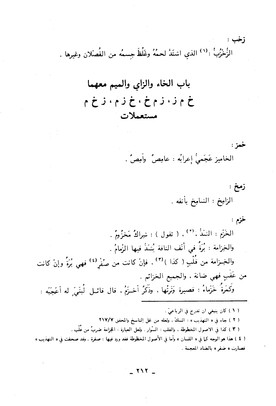 باب الخاء والزاي والميم معهما خ م ز، ز م خ، خ ز م، ز خ م مستعملات