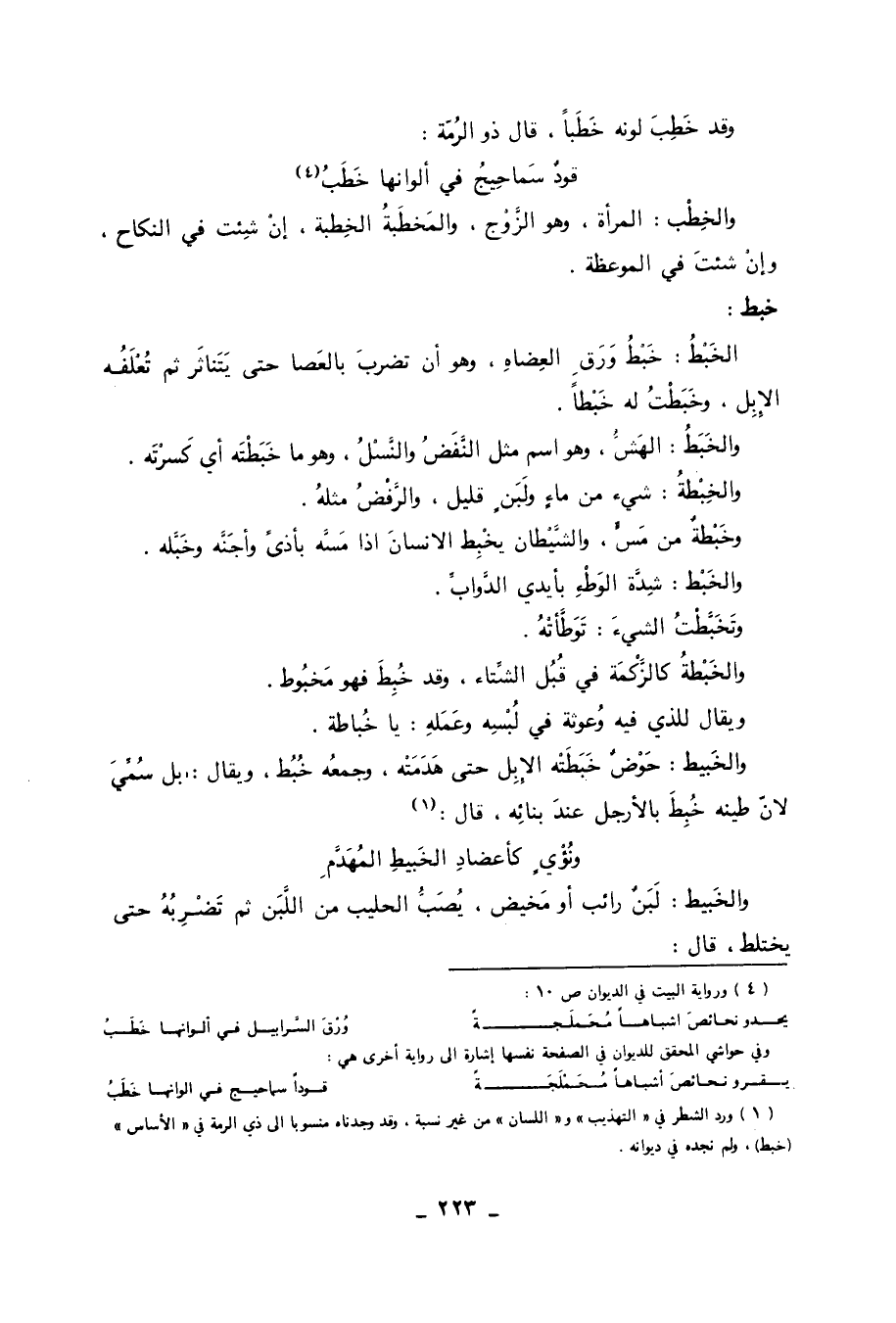 (2) ورد الشطر في التهذيب واللسان من غير نسبة، وقد وجدناه منسوبا إلى (ذي الرمة) في الأساس (خبط) ، ولم نجده في ديوانه.