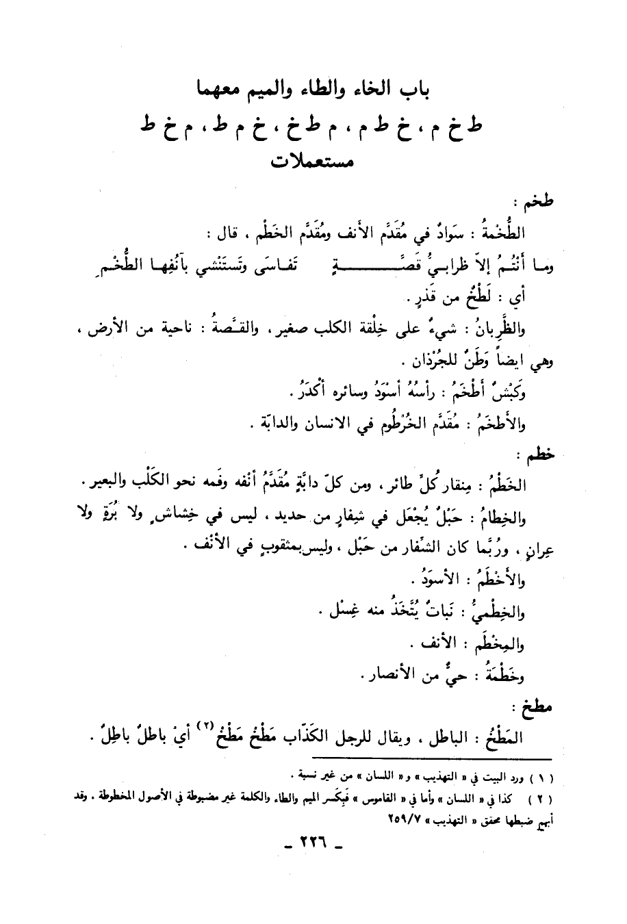 باب الخاء والطاء والميم معهما ط خ م، خ ط م، م ط خ، خ م ط، م خ ط مستعملات