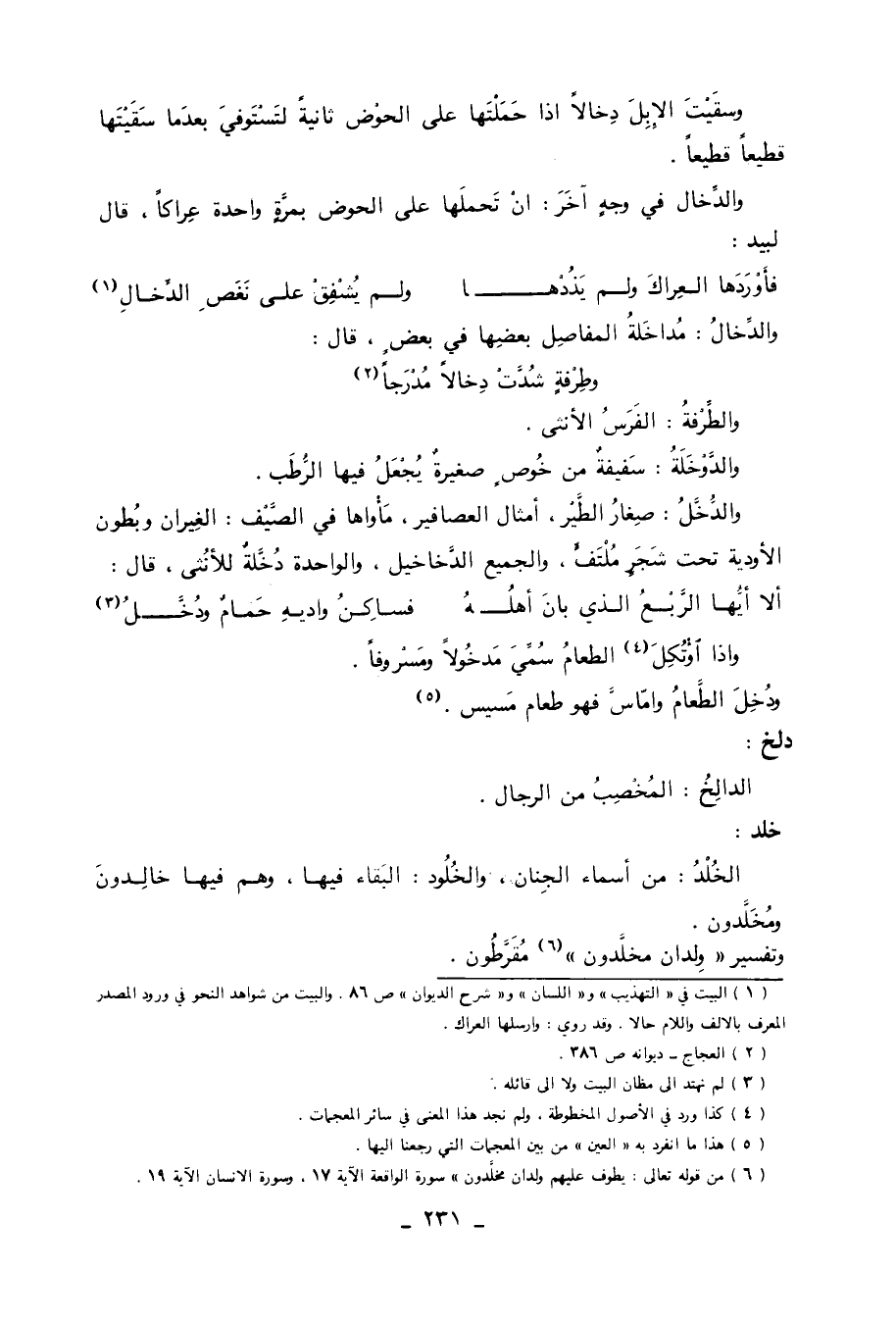 وسقيت الإبل دِخالاً إذا حملتها على الحوض ثانية لتستوفي بعد ما سقيتها قطيعا قطيعا. والدَّخال في وجه آخر: إن تحملها على الحوض بمرة واحدة عراكا، قال لبيد: