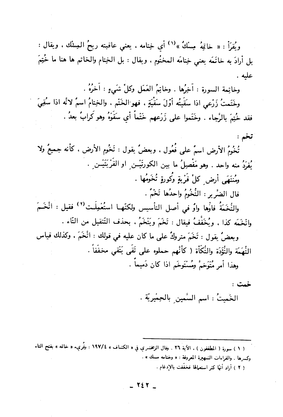 (1) سورة (المطففون) ، الآية 26. وقال الزمخشري في الكشاف 4/ 197: وقرىء خاتمه بفتح التاء وكسرها. والقراءات الشهيرة المعروفة: خِتامُهُ مِسْكٌ.