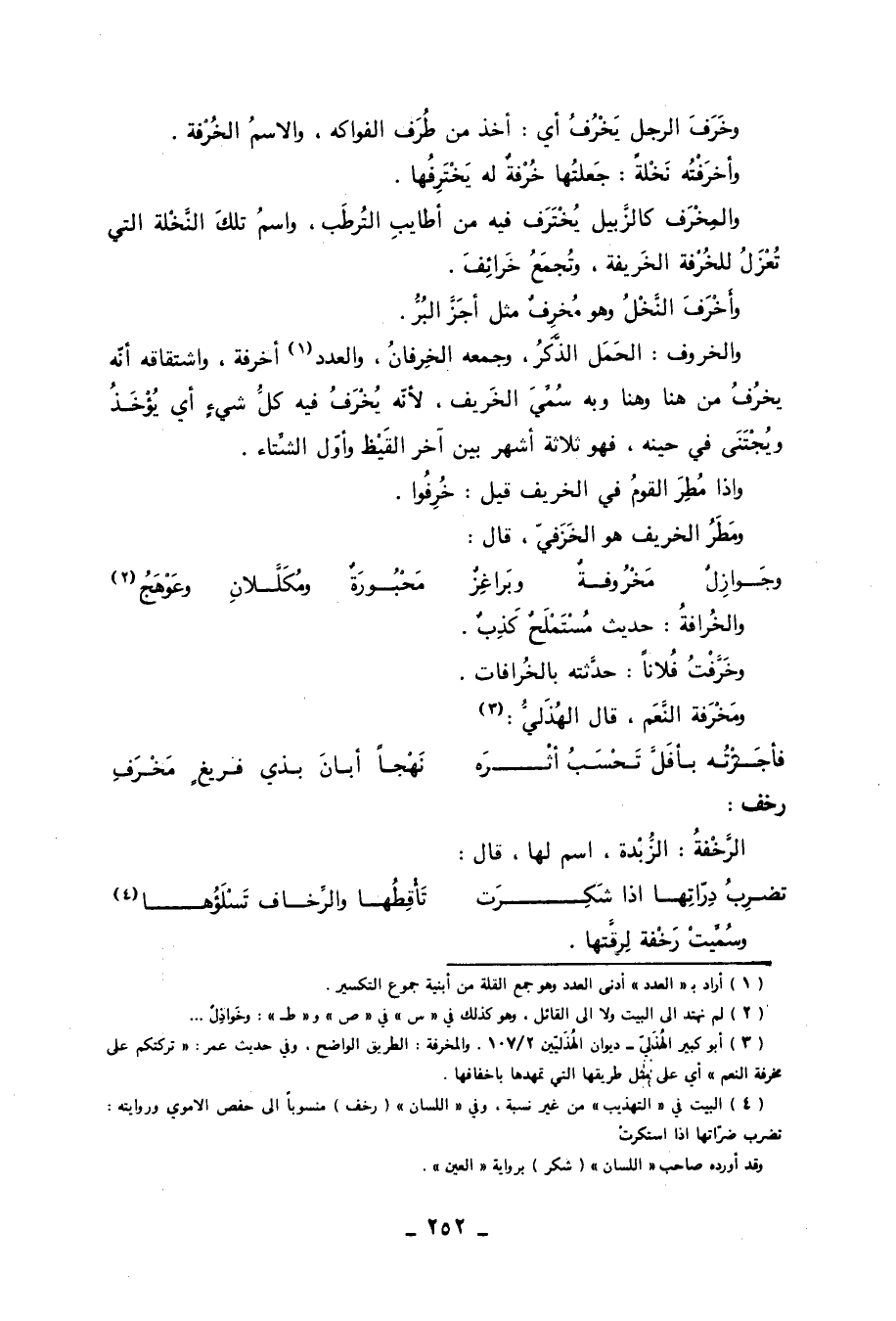 وخَرَفَ الرجل يَخْرُفُ أي: أخذ من طُرَف الفواكه، والأسم الخُرْفة. وأخرَفْتُه نخلةً: جعلتها خُرْفةٌ له يَخْتَرِفُها. والمِخْرَف كالزَّبيل يُخْتَرَف فيه من أطايب التُرطَب، واسم تلك النَّخْلة التي تُعْزَلُ للخُرْفة الخَريفة، وتجمع خَرائِفَ. وأَخْرَفَ النَّخْلُ وهو مُخرِفٌ مثل أجَزَّ البُرُّ. والخروف: الحمل الذَّكَرُ، وجمعه الخِرفانُ، والعدد «1» أخرفة، واشتقاقه أنه يخرُفُ من هنا وهنا وبه سُمِّيَ الخريف، لأنه يُخْرَفُ فيه كل شيء أي يُؤْخَذُ ويُجْتَنَي في حينه، فهو ثلاثة أشهر بين آخر القيظ وأول الشتاء. وإذا مطر القوم في الخريف قيل: خُرِفُوا. ومطر الخريف هو الخَزَفيّ، قال: