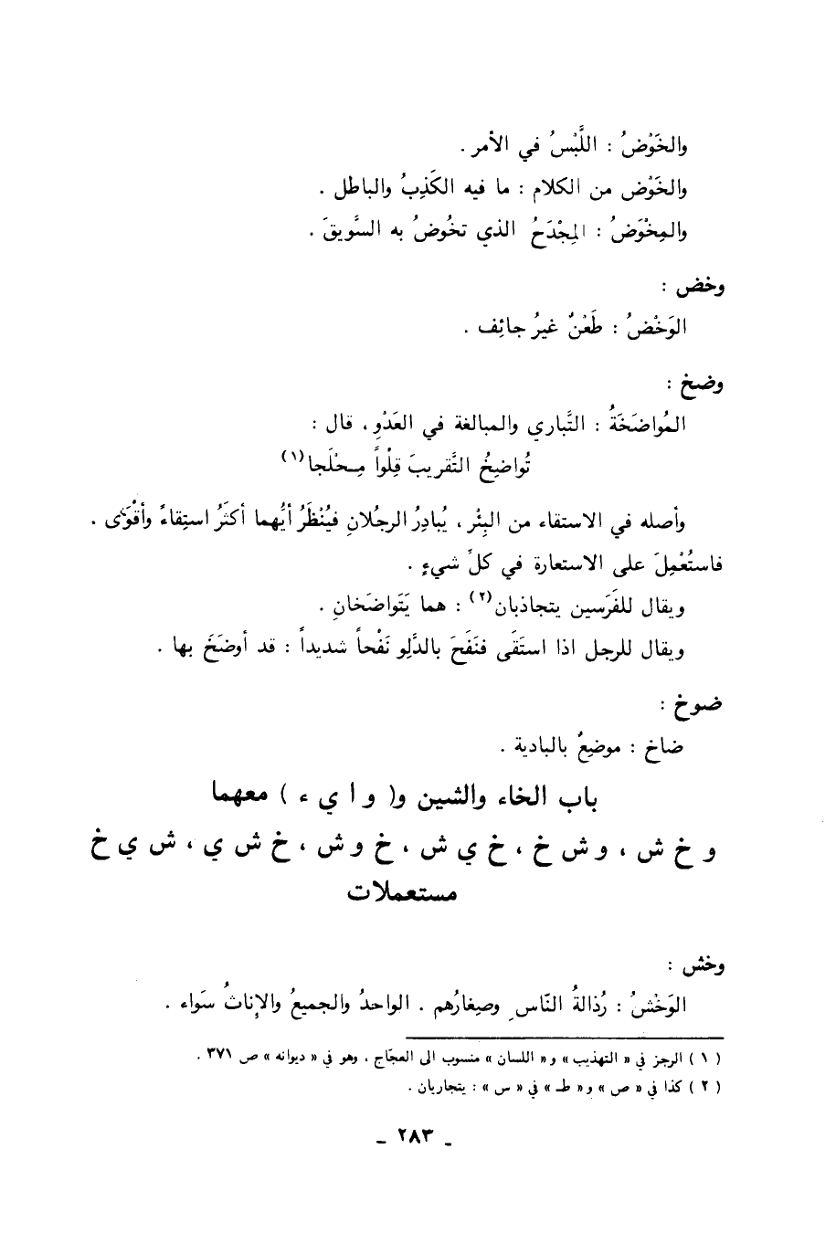 باب الخاء والشين و (وا يء) معهما وخ ش، وش خ، خ ي ش، خ وش، خ ش ي، ش ي خ مستعملات