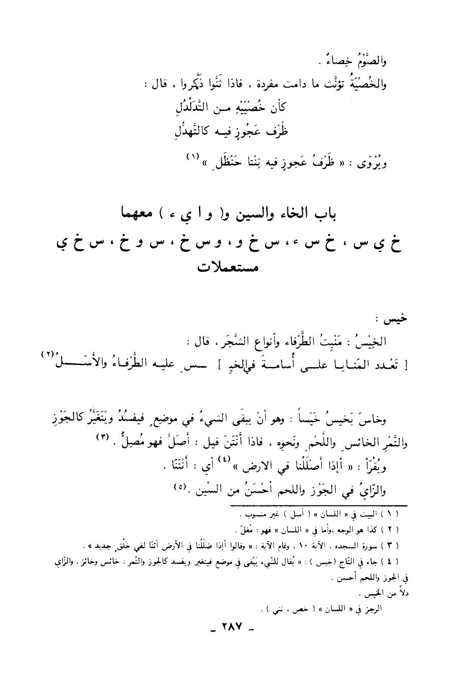 وخاسَ يَخيسُ خَيْساً: وهو أن يبقى الشيء في موضعٍ فيفسد ويتغير كالجوز والتمر الخائسِ واللَّحْمِِ ونحوه، فإذا أنتن قيل: أَصَلَّ فهو مُصِلٌّ «3» . ويقرأ: أإذا أَصْلَلْنا في الأرض «4» أي: أَنْتَنّا والزَّايُ في الجَوْز واللحم أحسن من السين «5» .