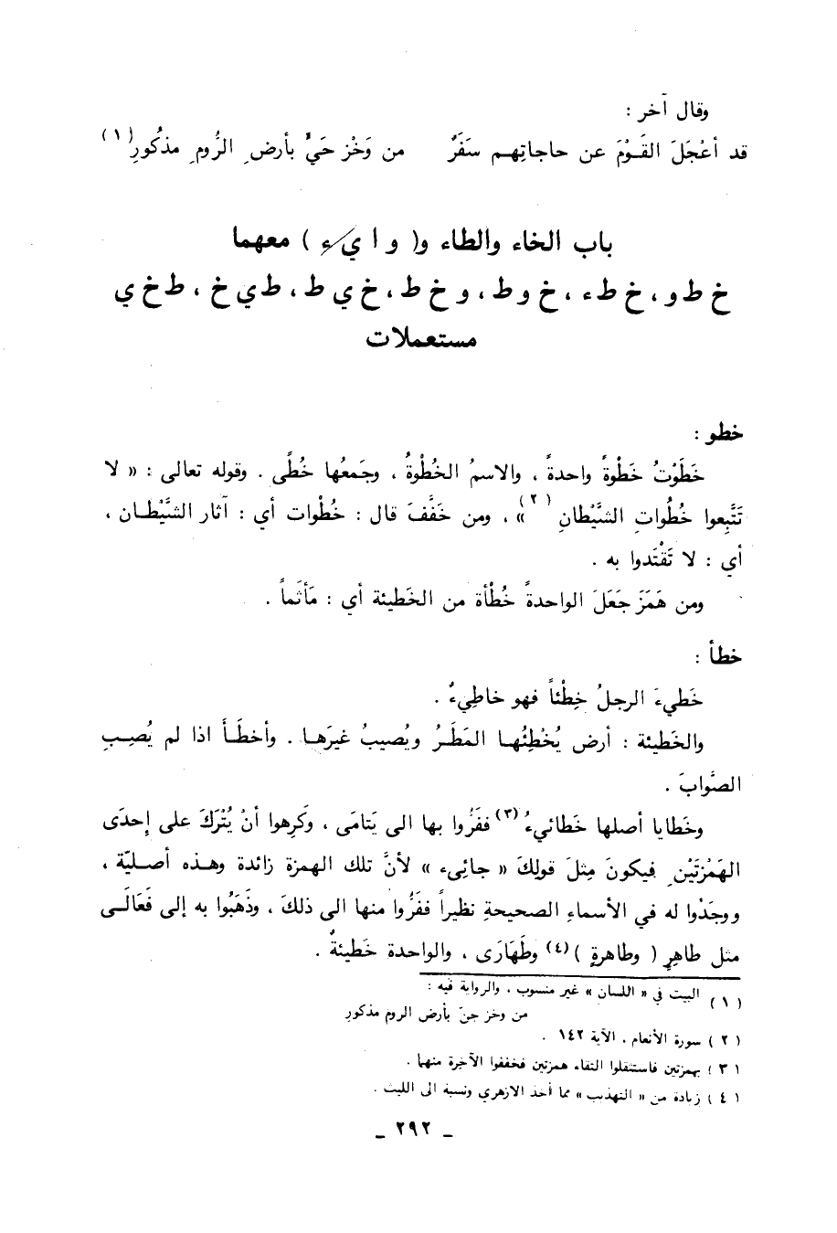 خطأ: خَطيءَ الرجلُ خِطْئاً فهو خاطِيءٌ. والخَطيئة: أرض يخطؤها المطر ويصيب غيرها. وأَخطَأَ إذا لم يصب الصواب. وخَطايا أصلها خَطائيء «3» ففروا بها إلى يتامى، وكرهوا أن يترك على إحدى الهمزتين فيكون مثل قولك جائِيء لأن تلك الهمزة زائدة وهذه أصلية، ووجدوا له في الأسماء الصحيحة نظيراً ففروا منها إلى ذلك، وذهبوا به إلى فعالي مثل طاهرٍ (وطاهرةٍ) «4» وطهارى، والواحدة خطيئة.