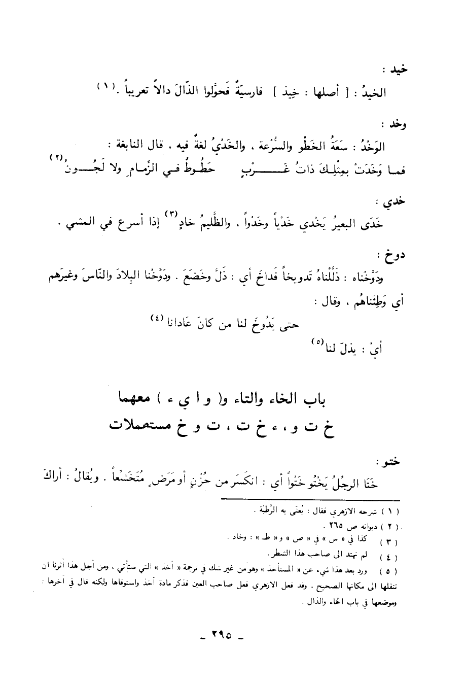 (5) ورد بعد هذا شيء عن المستأخذ وهو من غير شك في ترجمة أخذ التي ستأتي، ومن أجل هذا آثرنا إن ننقلها إلى مكانها الصحيح، وقد فعل الأزهري فعل صاحب العين فذكر مادة أخذ واستوفاها ولكنه قال في آخرها: وموضعها في باب الخاء والذال.