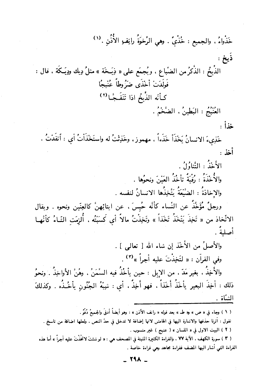 (1) وجاء في ص وط بعد قوله رانف الأذن: وهو أيضا أدفى والجميع دفو. نقول: آثرنا حذفها والإشارة إليها في الهامش لأنها إضافة لا تدخل في حد النص، ولعلها إضافة من ناسخ.