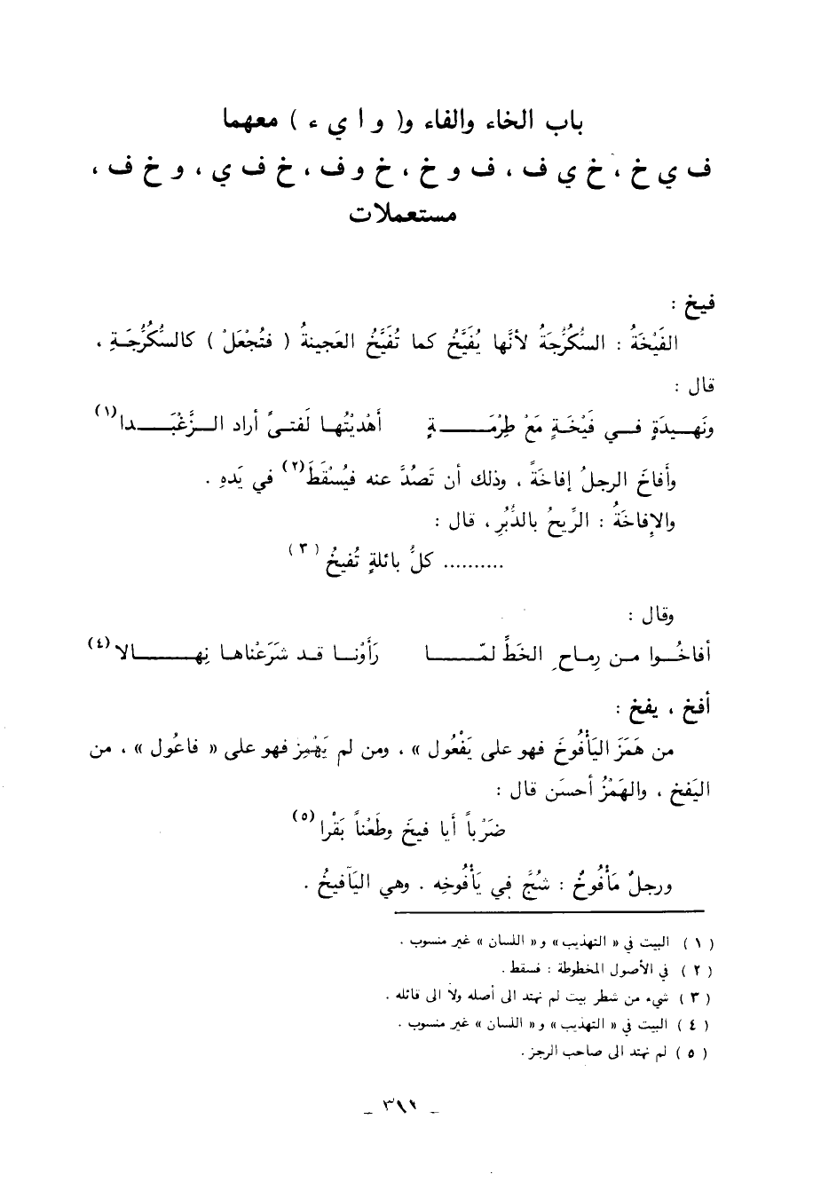 باب الخاء والفاء و (وا يء) معهما ف ي خ، خ ي ف، ف وخ، خ وف، خ ف ي، وخ ف، مستعملات