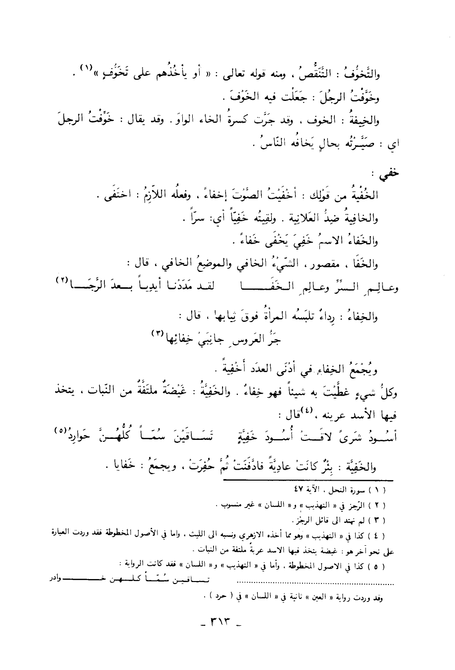 ويجمعُ الخِفاء في أدنى العدد أَخْفِيهً. وكل شيء غطيت به شيئاً فهو خِفاءٌ. والخَفِيَّةُ: غَيْضَةٌ ملتفة من النبات، يتخذ فيها الأسد عرينه، «4» قال: