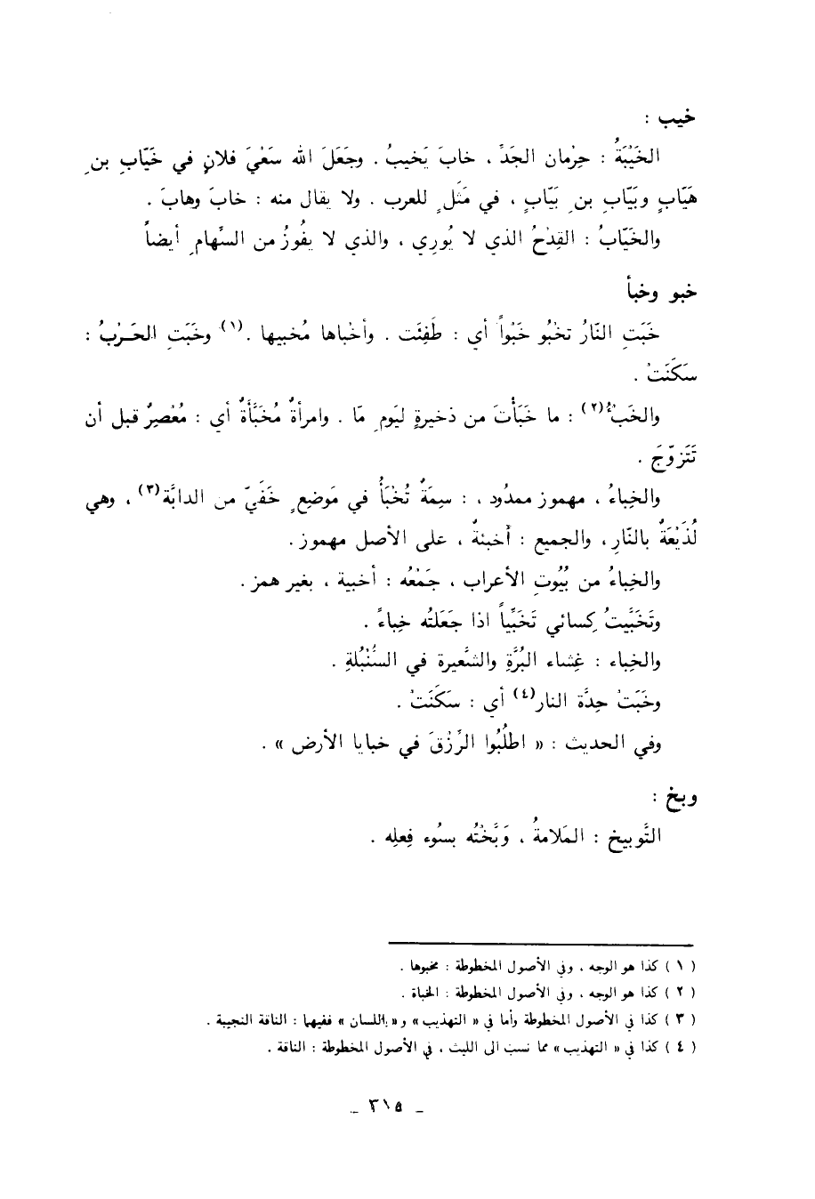 خبو وخبا: خَبَتِ النّار تخبو خَبْواً أي: طَفِئَت. وأخْباها مُخبيها «1» . وخَبَتِ الحرب: سكنت. والخَبءُ «2» : ما خَبَأْتَ من ذخيرةٍ ليوم ما. وامرأة مُخَبَّأَةٌ أي: معصر قبل أن تتزوج. والخِباءُ، مهموز ممدود،: سمةٌ تُخْبَأُ في موضعٍ خَفَيّ من الدابة «3» ، وهي لذيعة بالنار، والجميع: أخبئةٌ، على الأصل مهموز. والخِباءُ من بيوت الأعراب، جمعه: أخبية، بغير همز. وتَخَبَّيتُ كسائي تَخَبِّياً إذا جعلته خِباءً. والخِباء: غشاء البرة والشعيرة في السنبلة. وخَبَتْ حدة النار «4» أي: سكنتُ.