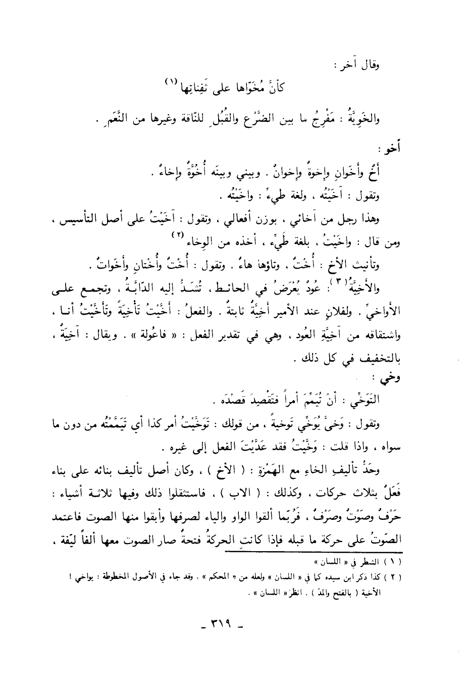 أخو: أَخٌ وأَخَوانِ وإِخوةٌ وإِخوانٌ. وبيني وبينه أُخُوَّةٌ وإِخاءُ. وتقول: آخَيْتُه، ولغة طيء: واخَيْتُه. وهذا رجل من آخائي، بوزن أفعالي، وتقول: آخَيْتُ على أصل التأسيس، ومن قال: واخَيْتُ، بلغة طيء، أخذه من الوِخاء «2» وتأنيث الأَخ: أُخْتٌ، وتاؤها هاءٌ. وتقول: أُخْتٌ وأُخْتانِ وأَخَواتٌ. والأَخِيَّةُ: «3» عودٌ يعرضُ في الحائط، تشد إليه الدابة، وتجمع على الأَواخيُّ. ولفلانٍ عند الأمير أَخِيَّةٌ ثابتةٌ. والفعل: أَخَّيْتُ تَأْخِيَةً وتَأَخَّيْتُ أنا، واشتقاقه من آخِيَّةِ العود، وهي في تقدير الفعل: فاعُولة. ويقال: آخِيَةٌ، بالتخفيف في كل ذلك.