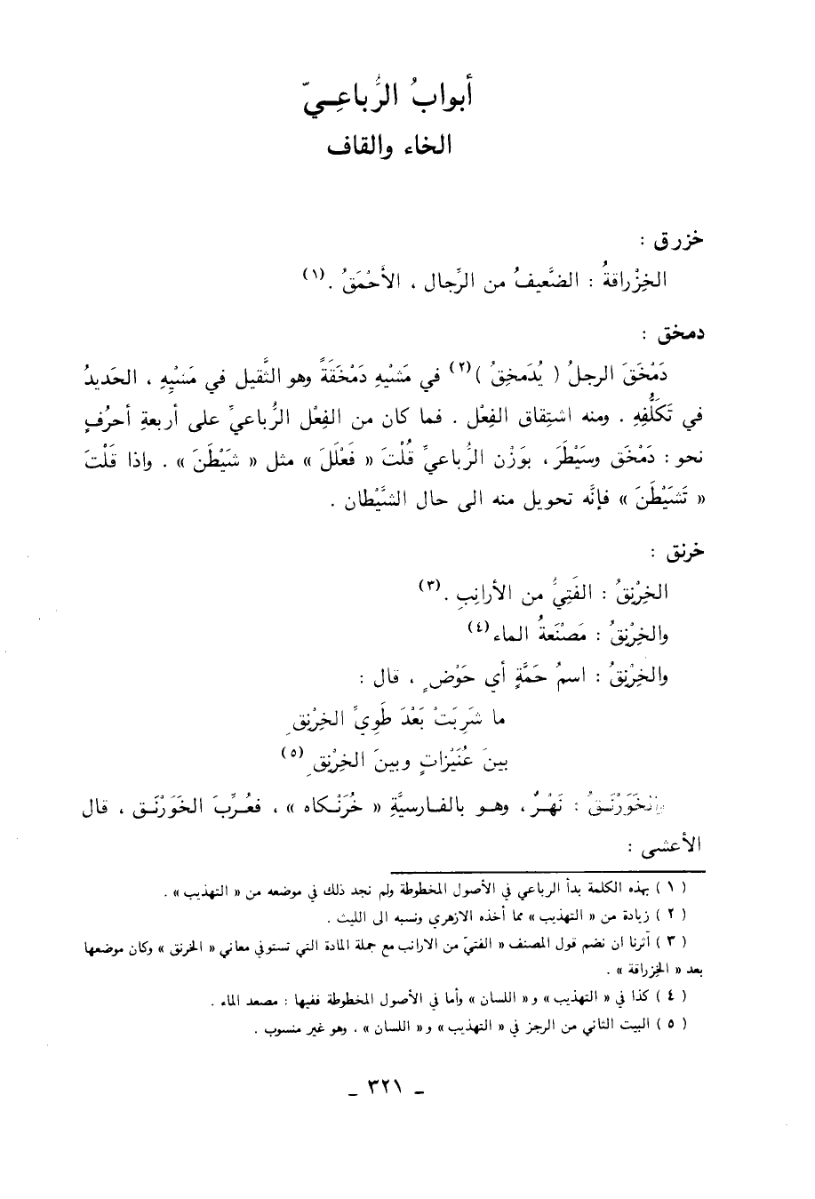 (3) آثرنا أن نضم قول المصنف الفتي من الأرانب مع جملة المادة التي تستوفي معاني الخرنق وكان موضعها بعد الخزراقة.