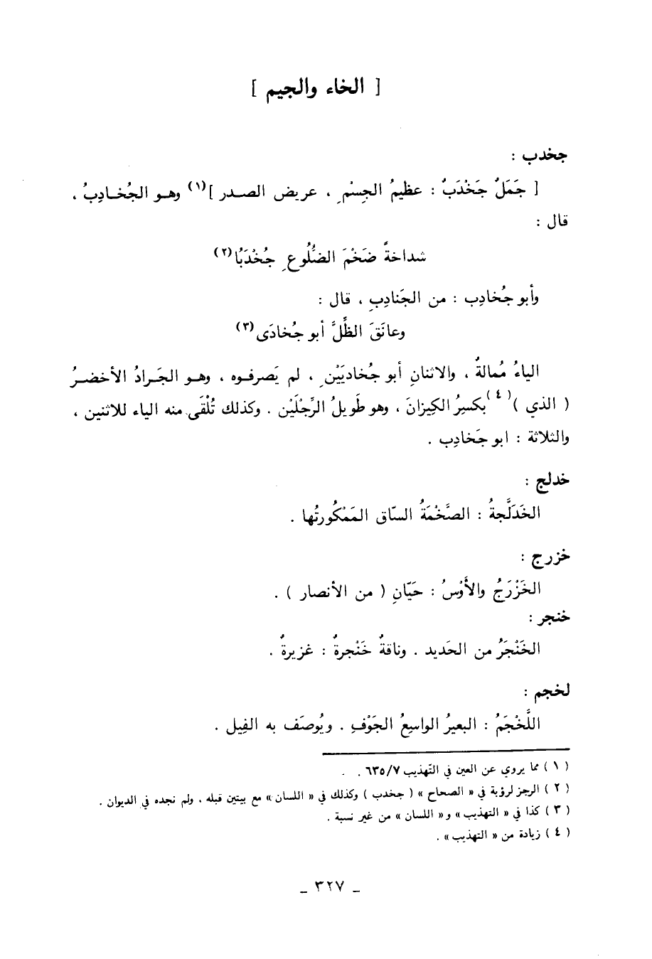 (2) الرجز (لرؤبة) في الصحاح (جخدب) وكذلك في اللسان مع بيتين قبله، ولم نجده في الديوان.