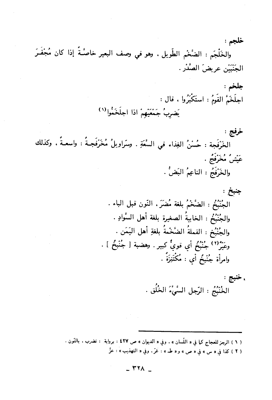 جنبخ: الجُنْبُخُ: الضخم بلغة مضر، النون قبل الباء. والجُنْبُخُ: الخابية الصغيرة بلغة أهل السواد. والجُنْبُخ: القملة الضخمة بلغة أهل اليمن. وعَيْرٌ «2» جُنْبُخٌ أي قوي كبير. وهضبة [جُنْبخٌ] . وامرأة جُنْبخٌ أي: مُكْتَنِزَةٌ.