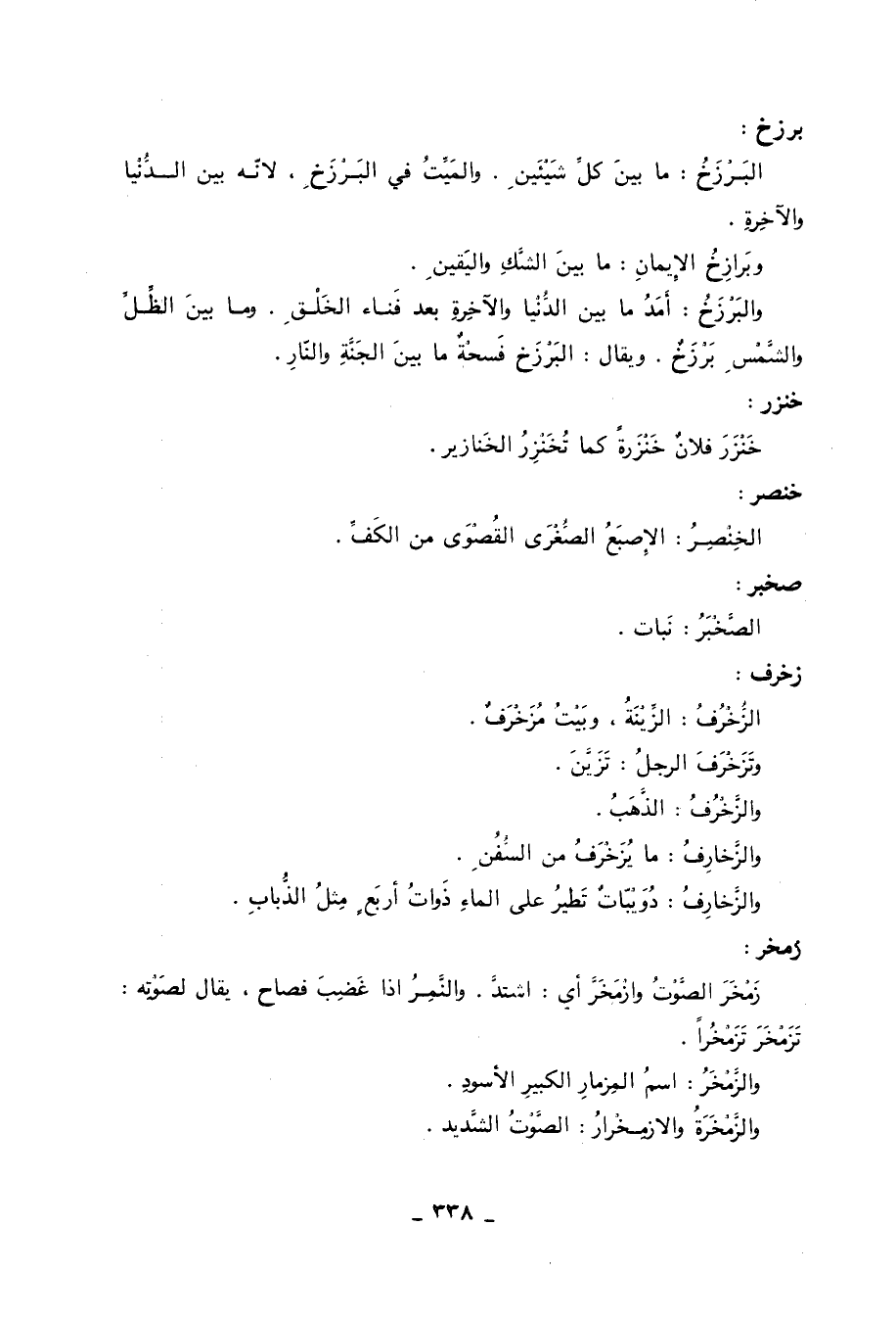 زمخر: زَمْخَرَ الصوت وازْمَخَرَّ أي: اشتد. والنمر إذا غضب فصاح، يقال لصوته: تَزَمْخَرَ تَزَمْخُراً. والزَّمْخَرُ: اسم المزمار الكبير الأسود. والزَّمْخَرَةُ والازمِخرْارُ: الصوت الشديد.
