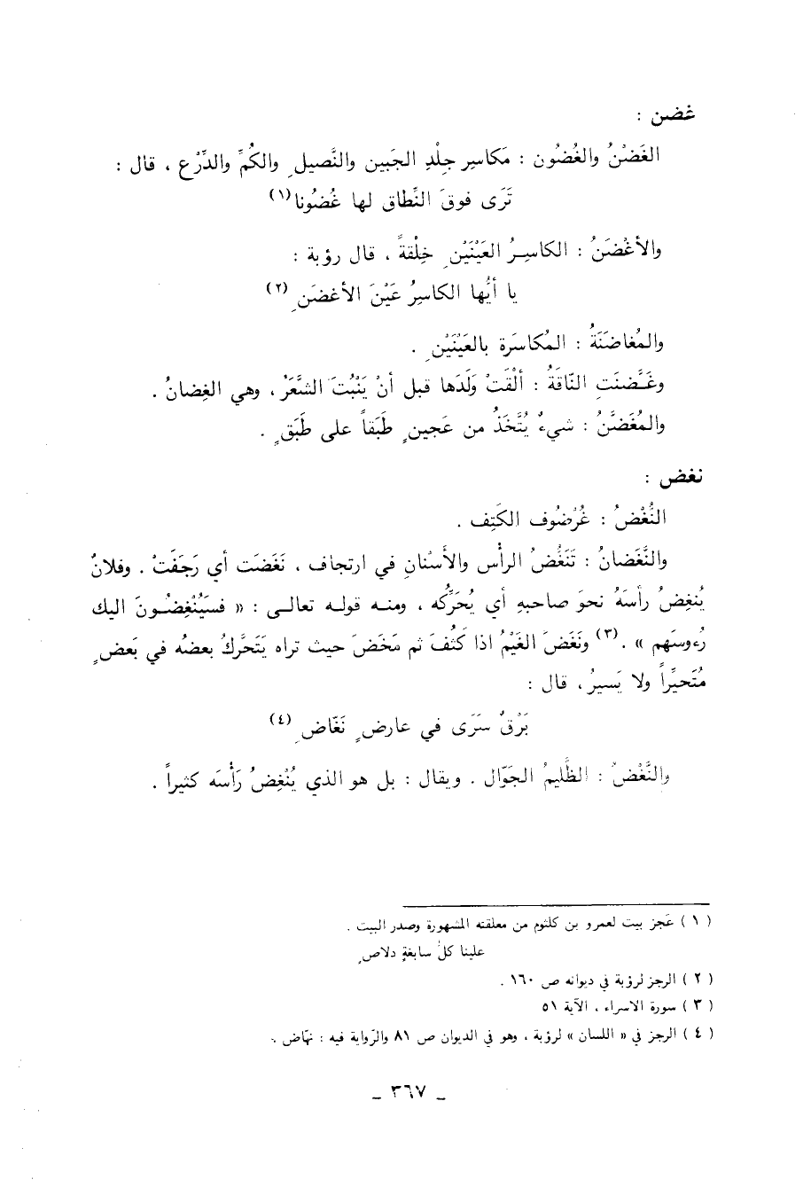 نغض: النُّغْضُ: غرضوف الكتف. والنَّغَضانُ: تَنَغُّضُ الرأس والأسنان في ارتجاف، نَغَضَت أي رجفت. وفلانٌ يُنِغضُ رأسه نحو صاحبه أي يحركه، ومنه قوله تعالى: فَسَيُنْغِضُونَ إِلَيْكَ رُؤُسَهُمْ «3» . ونَغَضَ الغَيْمُ إذا كثف ثم مَخَضَ حيث تراه يَتَحَّركُ بعضه في بعضٍ متحيراً ولا يسير، قال: