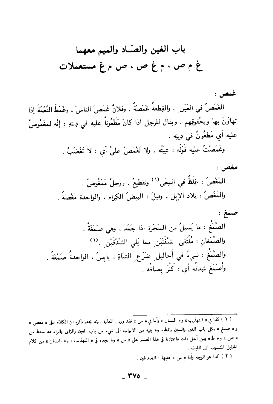 صمغ: الصَّمْغُ: ما يسيل من الشجرة إذا جمد، وهي صَمْغَةٌ. والصِّمْغانِ: ملتقى الشَّفَتَيْنِ مما يلي الشِّدْقَيْنِ «2» . والصَّمْغُ: شيء في أحاليلِ ضَرْعِ الشّاةِ، يابِسٌ، الواحدةُ صَمْغَةٌ. وأَصْمَغَ شِدقُه أي: كَثُرَ بصاقه.