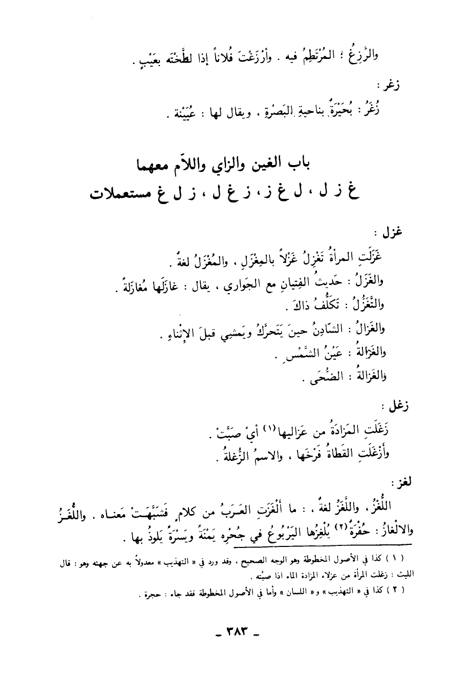 باب الغين والزاي واللام معهما غ ز ل، ل غ ز، ز غ ل، ز ل غ مستعملات