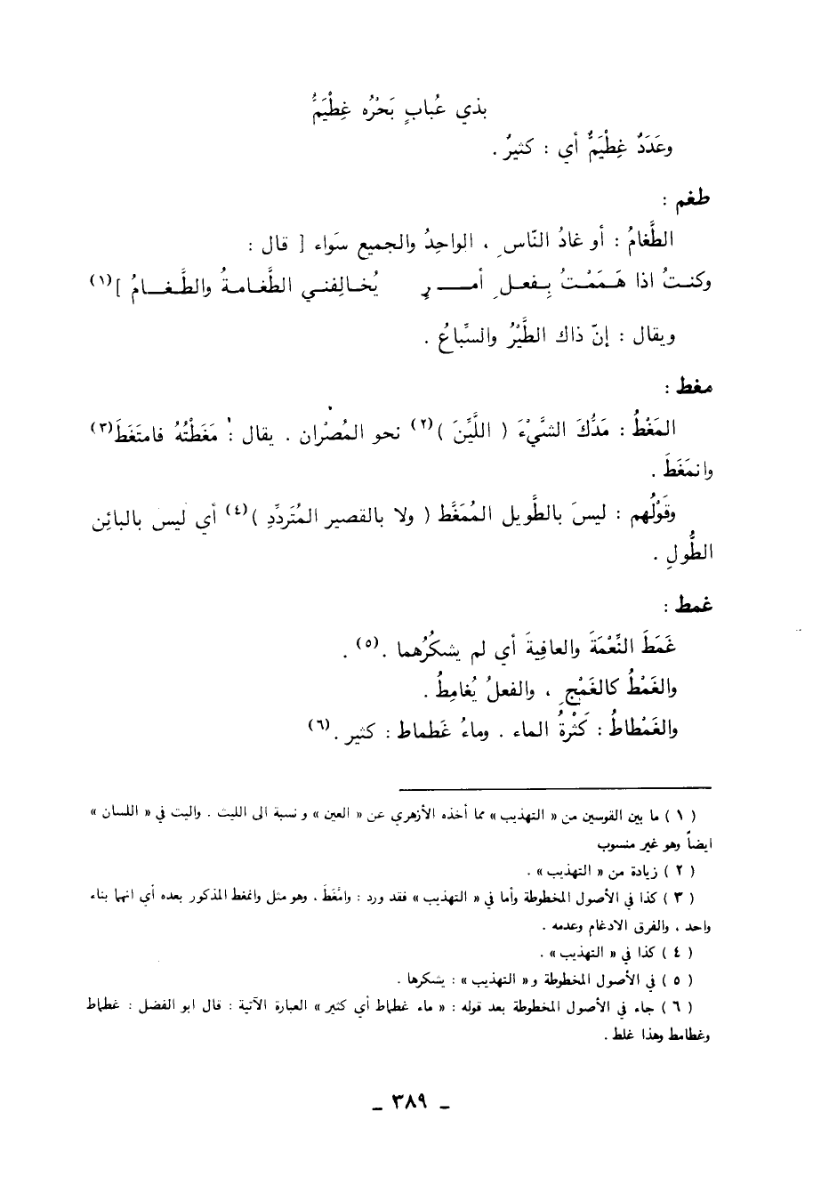 (6) جاء في الأصول المخطوطة بعد قوله: ماءغطماط أي كثير العبارة الآتية: قال أبو الفضل: غطماط وغطامط وهذا غلط.