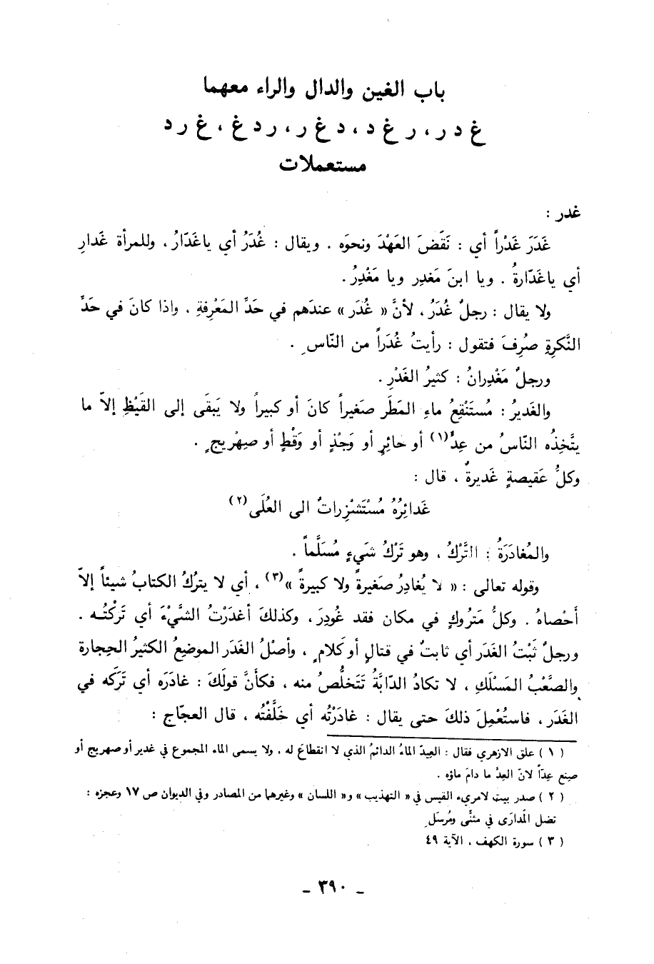 «3» ، أي لا يترك الكتاب شيئاً إلا أحصاه. وكل متروكٍ في مكان فقد غُودِرَ، وكذلك أغدَرْتُ الشيء أي تركتُه. ورجل ثبت الغَدَر أي ثابت في قتالٍ أو كلامٍ. وأصل الغَدَر الموضع الكثير الحجارة والصعب المسلك، لا تكاد الدابة تتخلص منه، فكأن قولك: غادَرَه أي تركه في الغَدَر، فاستعمل ذلك حتى يقال: غادَرْتُه أي خَلَّفْتُه، قال العجاج: