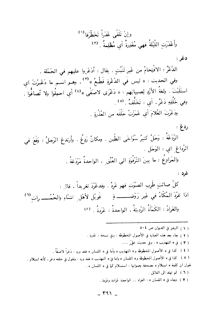 (5) كذا في الأصول المخطوطة واللسان وأما في التهذيب فقد ورد: وتقول في خلقه دغر، كأنه استلام. نقول إن كلمة استلام مصحفة وصوابها: استسلام كما في اللسان.
