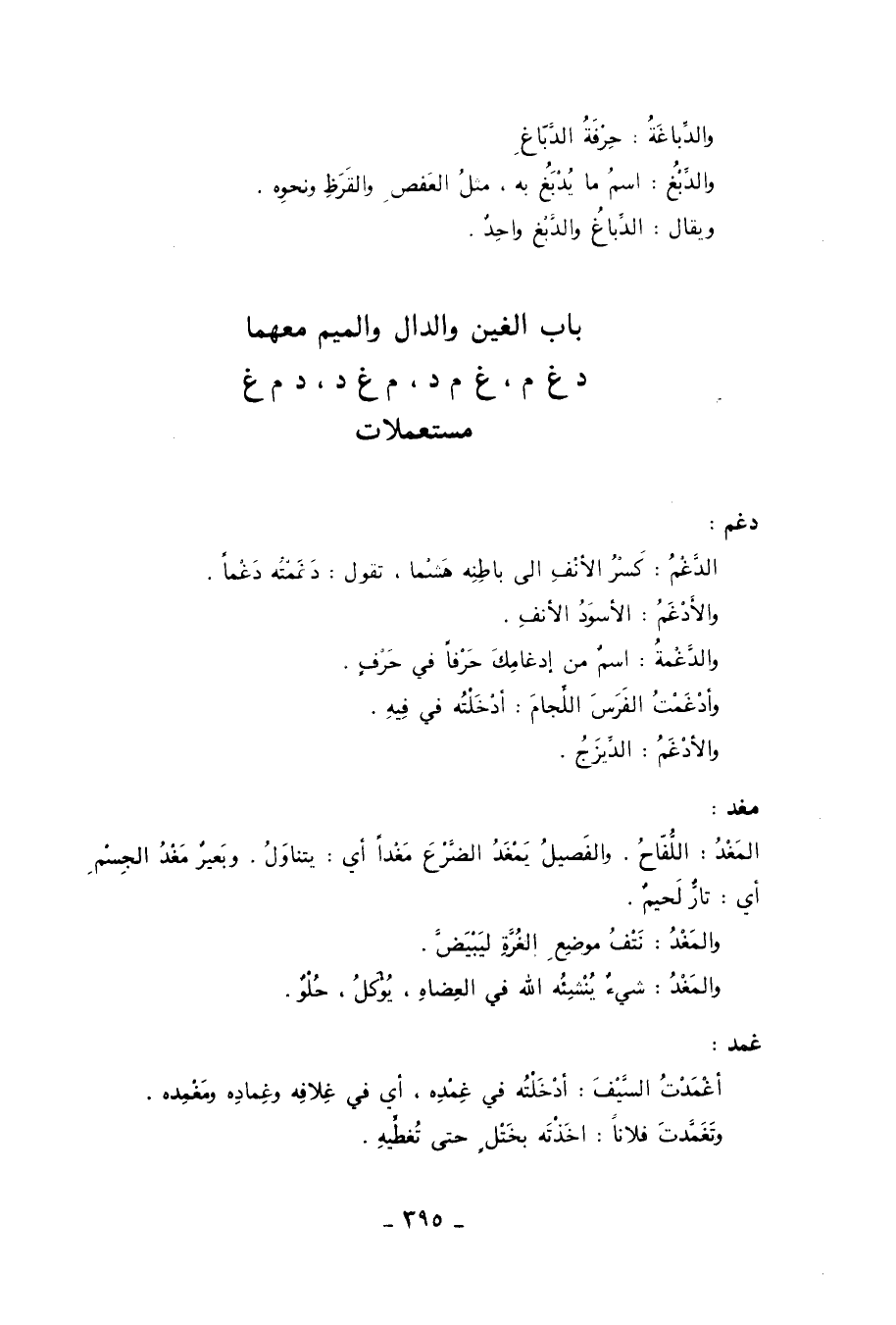 باب الغين والدال والميم معهما د غ م، غ م د، م غ د، د م غ مستعملات