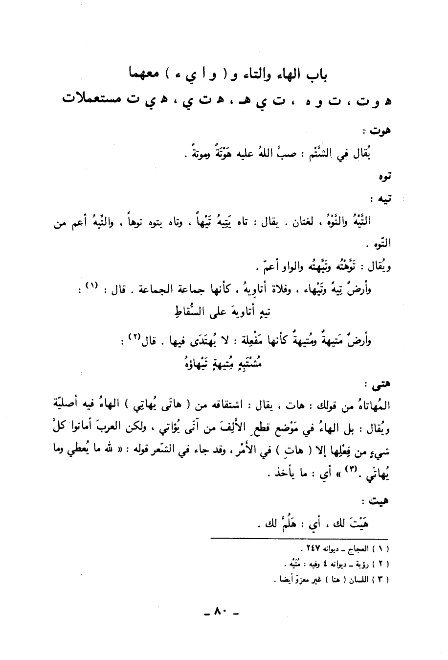 توه تيه: التَّيْهُ والتَّوْهُ، لغتان. يقال: تاه يَتِيهُ تَيْهاً، وتاه يتوه توهاً، والتِّيهُ أعم من التّوه. ويقال: تَوَّهْتُه وتَيَّهتُه والواو أعم. وأرض تِيهً وتَيْهاء، وفلاة أتاوِيهُ، كأنها جماعة الجماعة. قال: «1» :