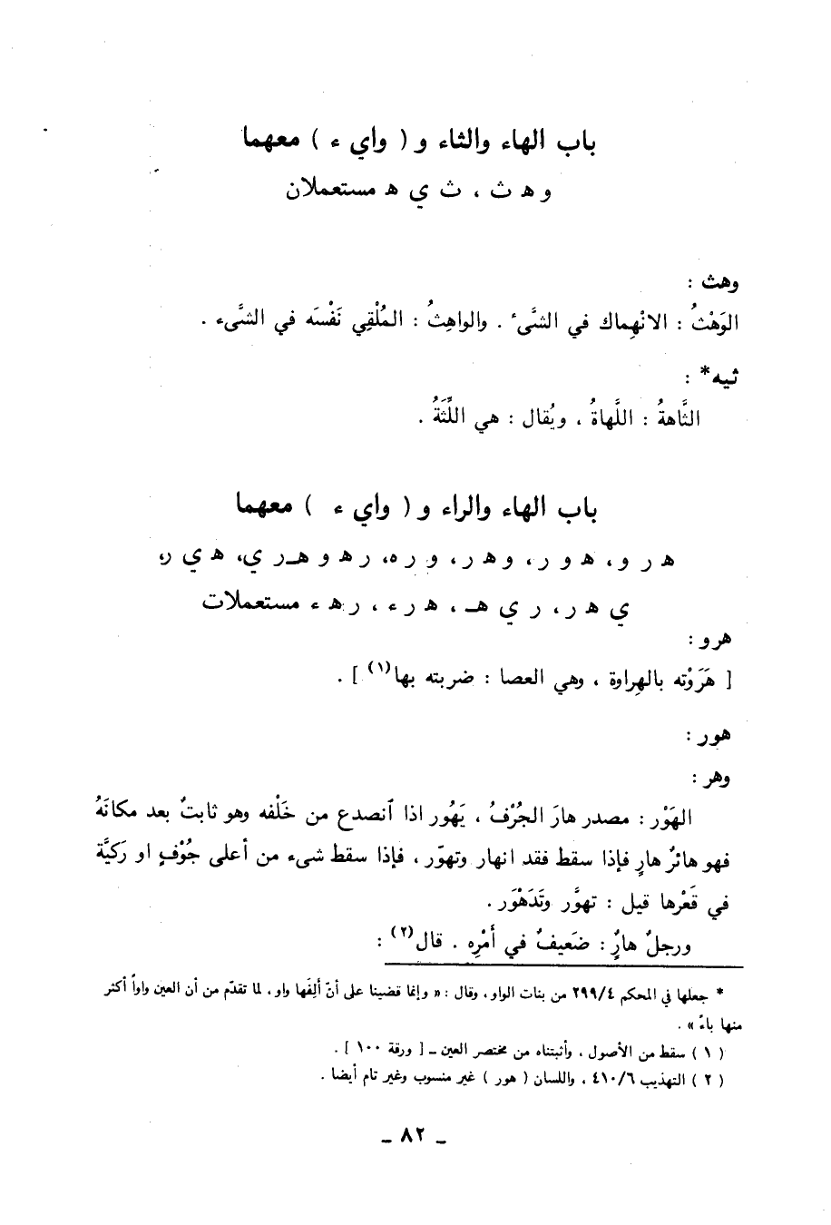 باب الهاء والراء و (وا يء) معهما هـ ر و، هـ ور، وهـ ر، ور هـ، ر هـ و، هـ ر ي، هـ ي ر، ي هـ ر، ر ي هـ-، هـ رء، ر هء مستعملات