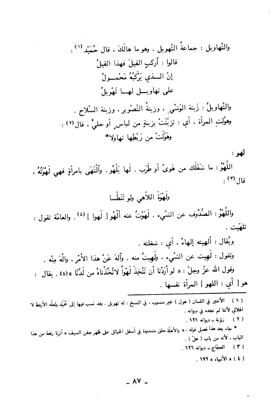 (1) الأخير في اللسان (هول) غير منسوب، في النسخ: له تهويل. وقد نسب فيها إلى (حميد) ولعله الأرقط لا الهلالي لأننا لم نجده في ديوانه.