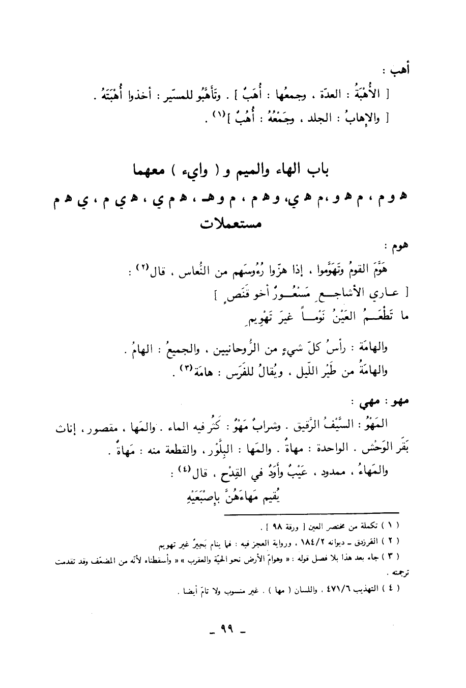 باب الهاء والميم و (وا يء) معهما هـ وم، م هـ و، م هـ ي، وهـ م، م وهـ، هـ م ي، هـ ي م، ي هـ م مستعملات