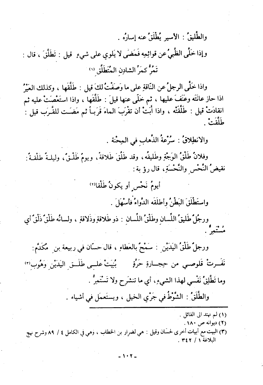 وإذا خلى الرجل عن الناقة على ما وصفت لك قيل: طَلَّقَها، وكذلك العير إذا حاز عانته وعنف عليها، ثم خلى عنها قيل: طَلَّقها، وإذا استعصت عليه ثم انقادت قيل: طَلَّقَتْه، وإذا أبت أن تقرب الماء قرباً ثم مضت للقرب قيل: طَلَّقَتْ. والانطِلاقُ: سرعة الذهاب في المحنة. وفلان طلق الوجة وطَليقُه، وقد طَلُقَ طلاقةُ، ويوم طَلقٌ، وليلة طَلْقةُ: نقيض النحس والنحسة، قال رؤبة: