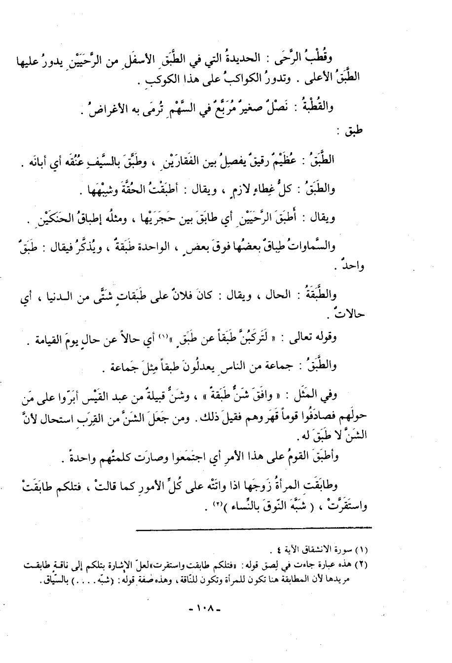 «1» أي حالاً عن حال يوم القيامة. والطَّبَقُ: جماعة من الناس يعدلون طبقاً مثل جماعة. وفي المثل: وافق شن طَبَقهُ، وشن قبيلة من عبد القيس أبروا على من حولهم فصادفوا قوماً قهروهم فقيل ذلك. ومن جعل الشن من القرب استحال لأن الشن لا طبق له. وأطبَقَ القوم على هذا الأمر أي اجتمعوا وصارت كلمتهم واحدة. وطابَقَتِ المرأة زوجها إذا واتته على كل الأمور كما قالت، فتلكم طابقت واستقرت، (شبه النوق بالنساء) «2» .