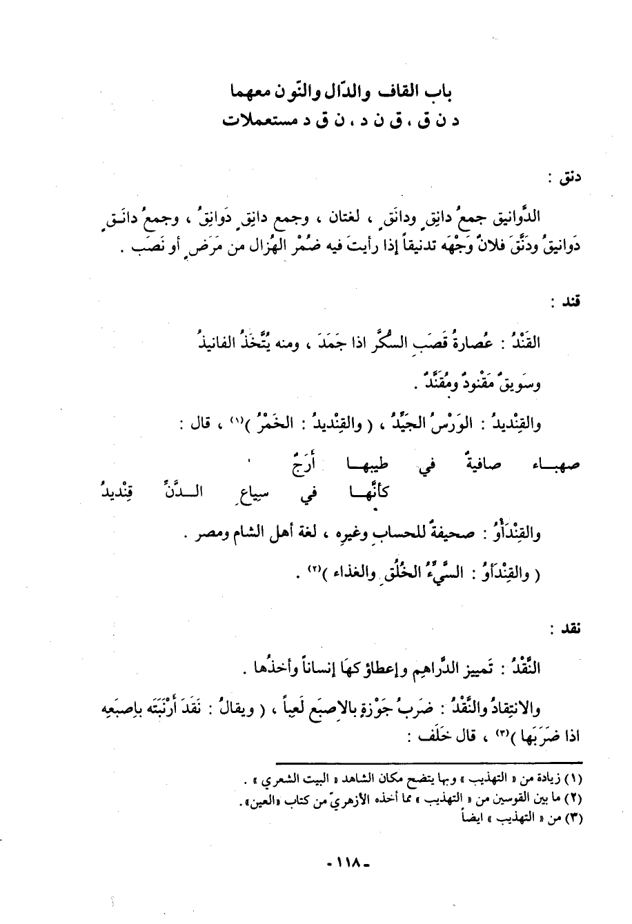 باب القاف والدال والنون معهما د ن ق، ق ن د، ن ق د مستعملات