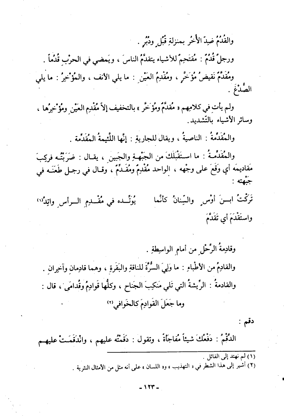 والقُدُمُ ضد الأخر بمنزلة قبل ودبر. ورجل قُدُمٌ: مقتحم للأشياء يتقدَّمُ الناس، ويمضي في الحرب قُدُماً. ومُقدَّمٌ نقيض مؤخر، ومُقْدِمُ العين: ما يلي الأنف، والمؤخر: ما يلي الصدغ. ولم يأت في كلامهم مُقدَّمٌ ومؤخر بالتخفيف إلا مُقْدِم العين ومؤخرها، وسائر الأشياء بالتشديد. والمُقَدِّمةُ: الناصية، ويقال للجارية: إنها اللئيمة المُقَدِّمة. والمُقَدِّمةُ: ما استقبلك من الجبهة والجبين، يقال: ضربته فركب مَقاديمَه أي وقع على وجهه، الواحد مُقدِم ومُقدِّمٌ، وقال في رجل طعنه في جبهته: