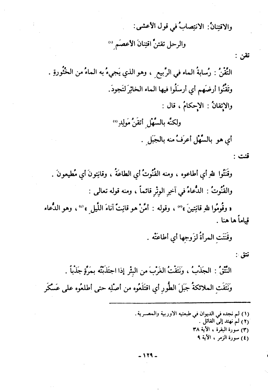 «4» ، وهو الدعاء قياماً هاهنا. وقَنَتَتِ المرأة لزوجها أي أطاعته.