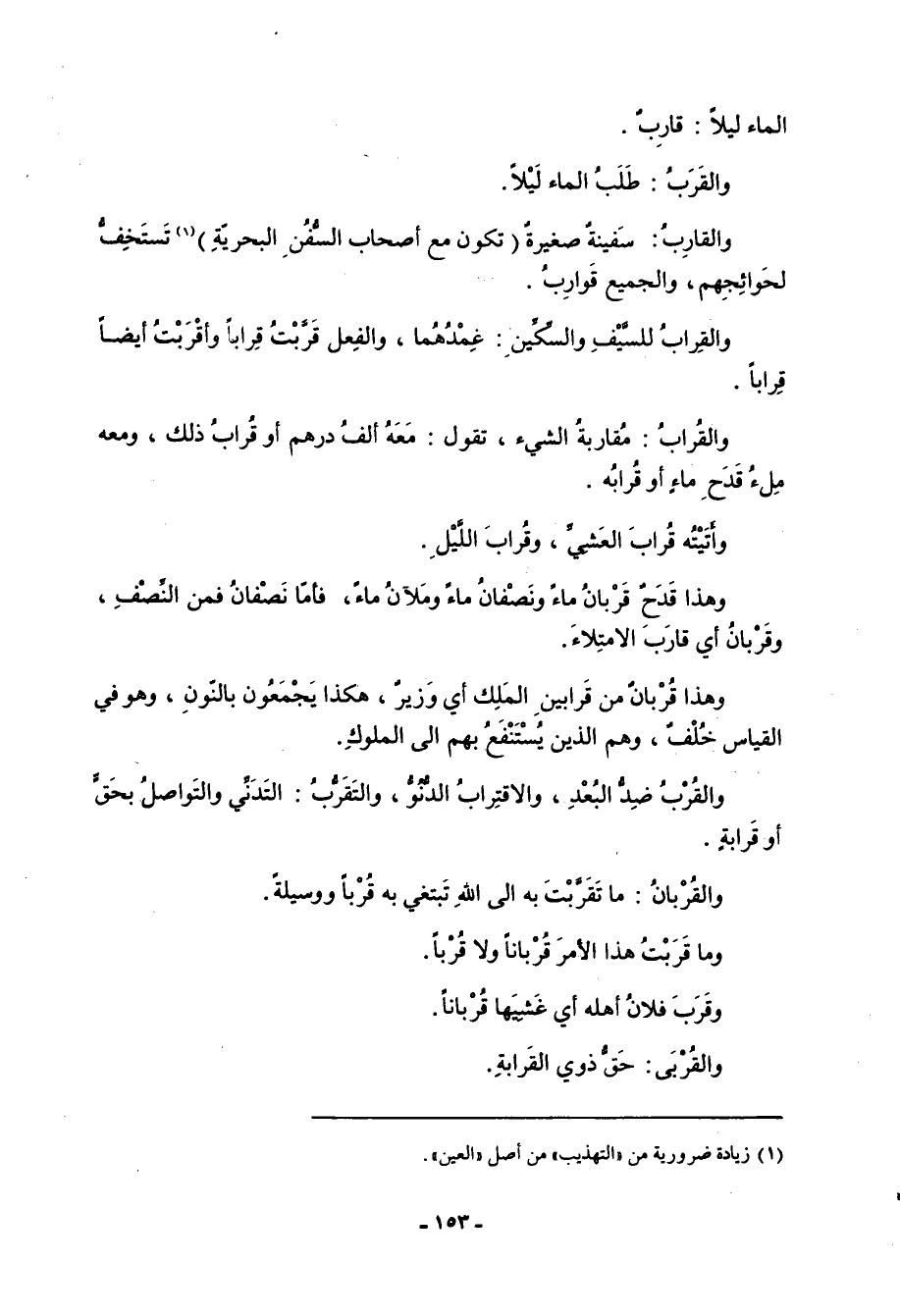 الماء ليلاً: قارِبٌ. والقَرَبُ: طلب الماء ليلاً. والقارِبُ: سفينة صغيرة (تكون مع أصحاب السفن البحرية) «1» تستخف لحوائجهم، والجميع قوارِبُ. والقِرابُ للسيف والسكين: غمدهما، والفعل قَرَّبْتُ قِراباً وأقْرَبْتُ أيضاً قِراباً. والقُرابُ: مُقاربةُ الشيء، تقول: معه ألف درهم أو قُرابُ ذلك، ومعه ملء قدح ماء أو قُرابُه. وأتيته قُرابَ العشي، وقُرابَ الليل. وهذا قدح قربان ماء ونصفان ماء وملآن ماء، فأما نصفان فمن النصف، وقَرْبانُ أي قارب الامتلاء. وهذا قُرْبانٌ من قَرابينِ الملك أي وزير، هكذا يجمعون بالنون، وهو في القياس خلف، وهم الذين يستنفع بهم إلى الملوك. والقُرْبُ ضد البعد، والاقتِرابُ الدنو، والتَقَرُّبُ: التدني والتواصل بحق أو قَرابةٍ. والقُرْبانُ: ما تَقَرَّبْتَ به إلى الله تبتغي به قُرْباً ووسيلة. وما قَرَبْتُ هذا الأمر قُرْباناً ولا قُرْباً. وقَرَبَ فلان أهله أي غشيها قرباناً. والقُرْبَى: حق ذوي القرابة.