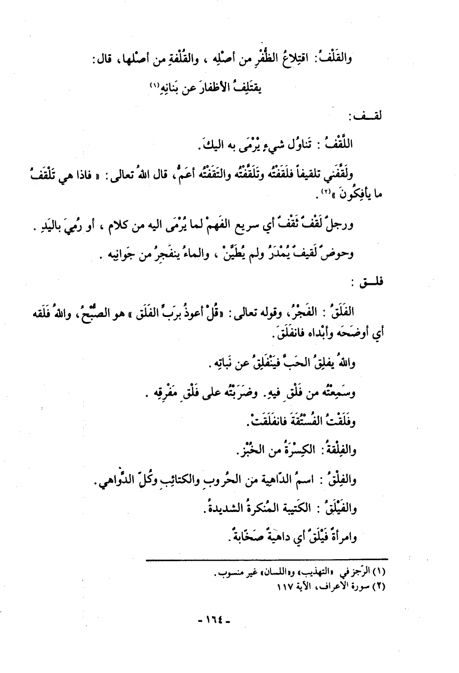 هو الصبح، والله فلقه أي أوضحه وأبداه فانفلَقَ. والله يفِلُق الحب فيَنْفَلِقُ عن نباته. وسمعته من فَلْقِ فيه. وضربته على فَلْقِِ مفرقه. وفَلَقْتُ الفستقة فانفَلَقَتْ. والفِلْقةُ: الكسرة من الخبز. والفِلْقُ: اسم الداهية من الحروب والكتائب وكل الدواهي. والفَيْلَقُ: الكتيبة المنكرة الشديدة. وامرأة فَيْلقٌ أي داهية صخابة.