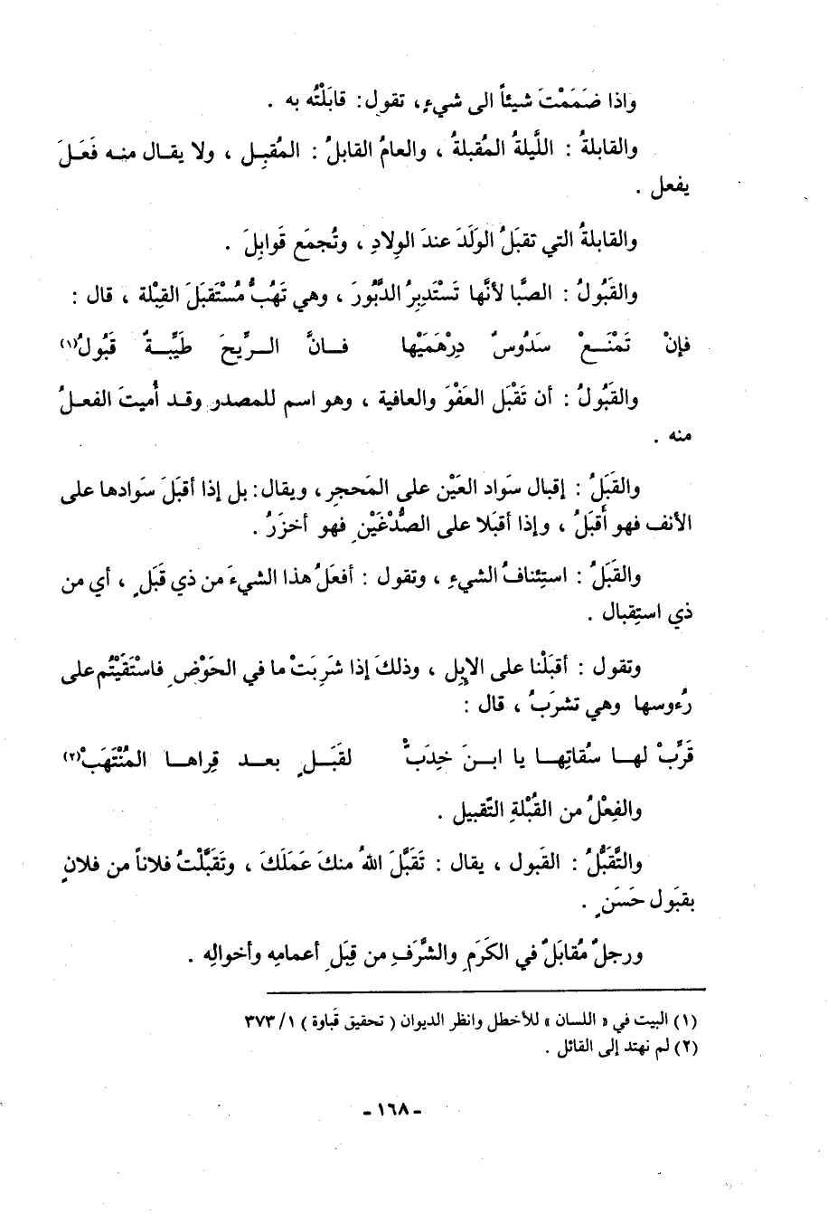 والقَبُولُ: أن تقبل العفو والعافية، وهو اسم للمصدر وقد أميت الفعل منه. والقبل: إقبال سواد العين على المحجر، ويقال: بل إذا أقبل سوادها على الأنف فهو أقبل، وإذا أقبلا على الصدغين فهو أخزر. والقَبَلُ: استئناف الشيء، وتقول: أفعل هذا الشيء من ذي قبل، أي من ذي استقبال. وتقول: أقبلنا على الإبل، وذلك إذا شربت ما في الحوض فاستقيتم على رءوسها وهي تشرب، قال: