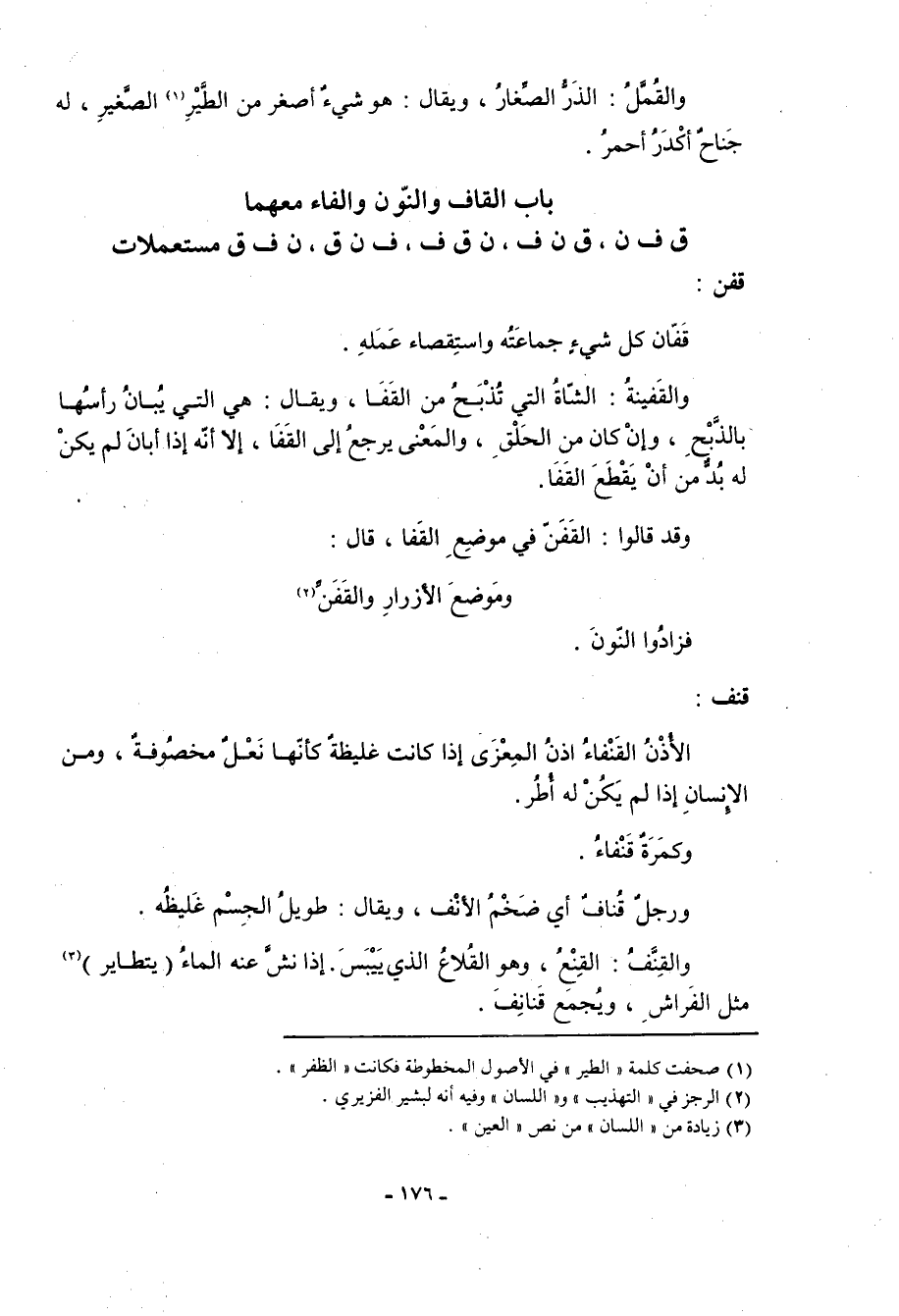 باب القاف والنون والفاء معهما ق ف ن، ق ن ف، ن ق ف، ف ن ق، ن ف ق مستعملات