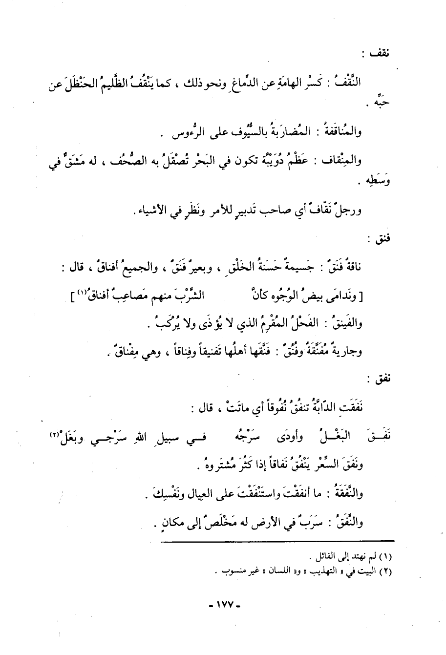 نقف: النَّقْفُ: كسر الهامة عن الدماغ ونحو ذلك، كما يَنْقُفُ الظليم الحنظل عن حبه. والمُناقَفةُ: المضاربة بالسيوف على الرءوس. والمِنْقاف: عظم دويبة تكون في البحر تصقل به الصحف، له مشق في وسطه. ورجل نَقّافٌ أي صاحب تدبير للأمر ونظر في الأشياء.