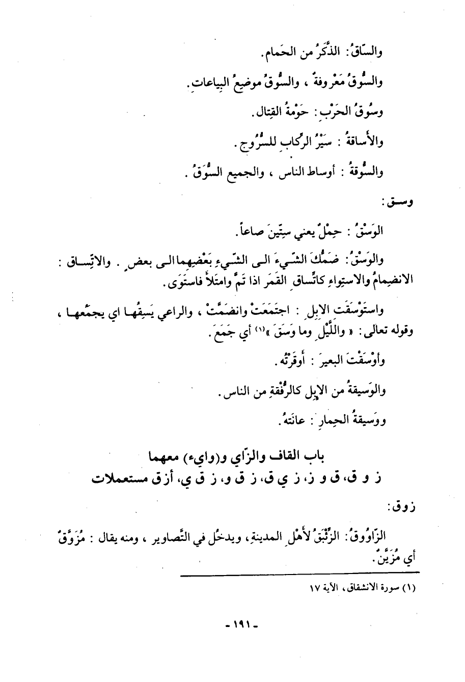 باب القاف والزاي و (وا يء) معهما ز وق، ق وز، ز ي ق، ز ق و، ز ق ي، أز ق مستعملات
