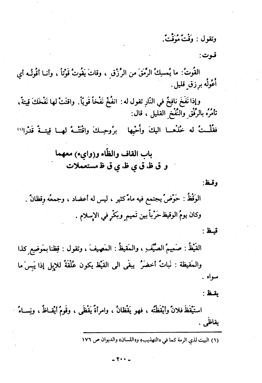 قوت: القُوتُ: ما يمسك الرمق من الرزق، وقات يقوت قوتاً، وأنا أقُوتُه أي أعوله برزق قليل. وإذا نفخ نافخ في النار تقول له: انفخ نفخاً قويا. واقتت لها نفخك قِيتةً، تأمره بالرفق والنفخ القليل، قال: