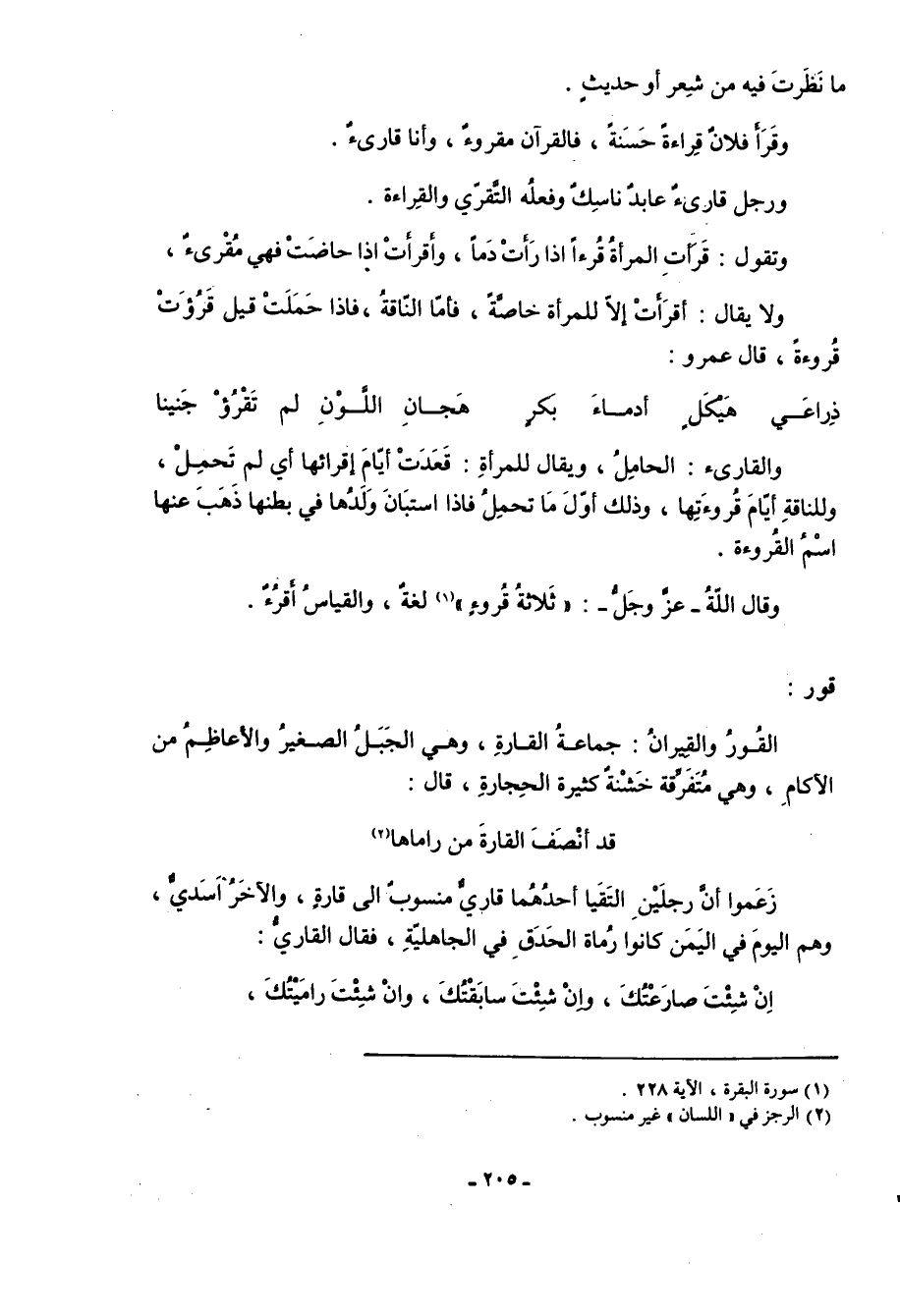 والقارىء: الحامل، ويقال للمرأة: قعدت أيام إقرائها أي لم تحمل، وللناقة أيام قروءتها، وذلك أول ما تحمل فإذا استبان ولدها في بطنها ذهب عنها اسم القروءة. وقال الله- عز وجل-: ثَلاثَةَ قُرُوءٍ «1» لغة، والقياس أَقرُءٌ.