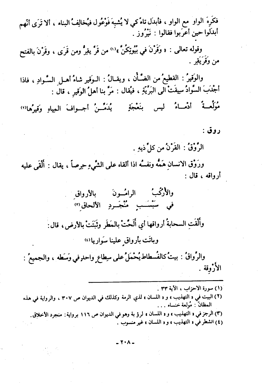 «1» من قَرّ يقِرُّ ومن قَرَى، وقَرْنَ بالفتح من وقَرَ يَقِر. والوَقيرُ: القطيع من الضأن، ويقال: الوَقير شاء أهل السواد، فإذا أجدب السواد سيقت إلى البرية، فيقال: مر بنا أهل الوَقيرِ، قال: