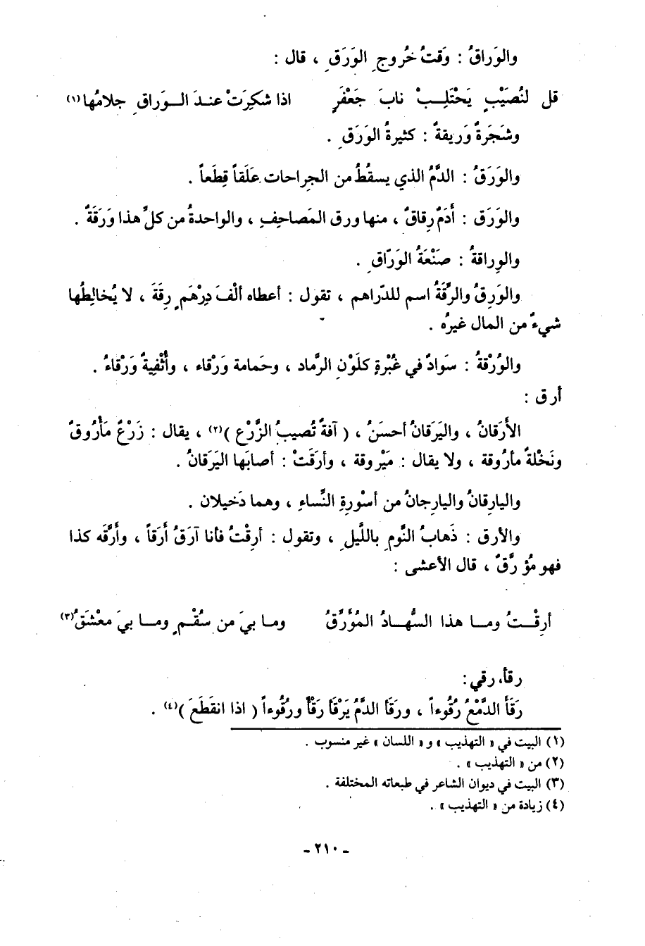أرق: الأَرَقانُ، واليَرَقانُ أحسن، (آفة تصيب الزرع) «2» ، يقال: زرع مَأْرُوقٌ ونخلة مأروقة، ولا يقال: مَيْروقة، وأَرَقَتْ: أصابها اليَرَقانُ. واليارِقانُ واليارجان من أسورة النساء، وهما دخيلان. والأرق: ذهاب النوم بالليل، وتقول: أَرِقْتُ فأنا آرَقُ أرَقاً، وأرقه كذا فهو مُؤرَّقٌ، قال الأعشى: