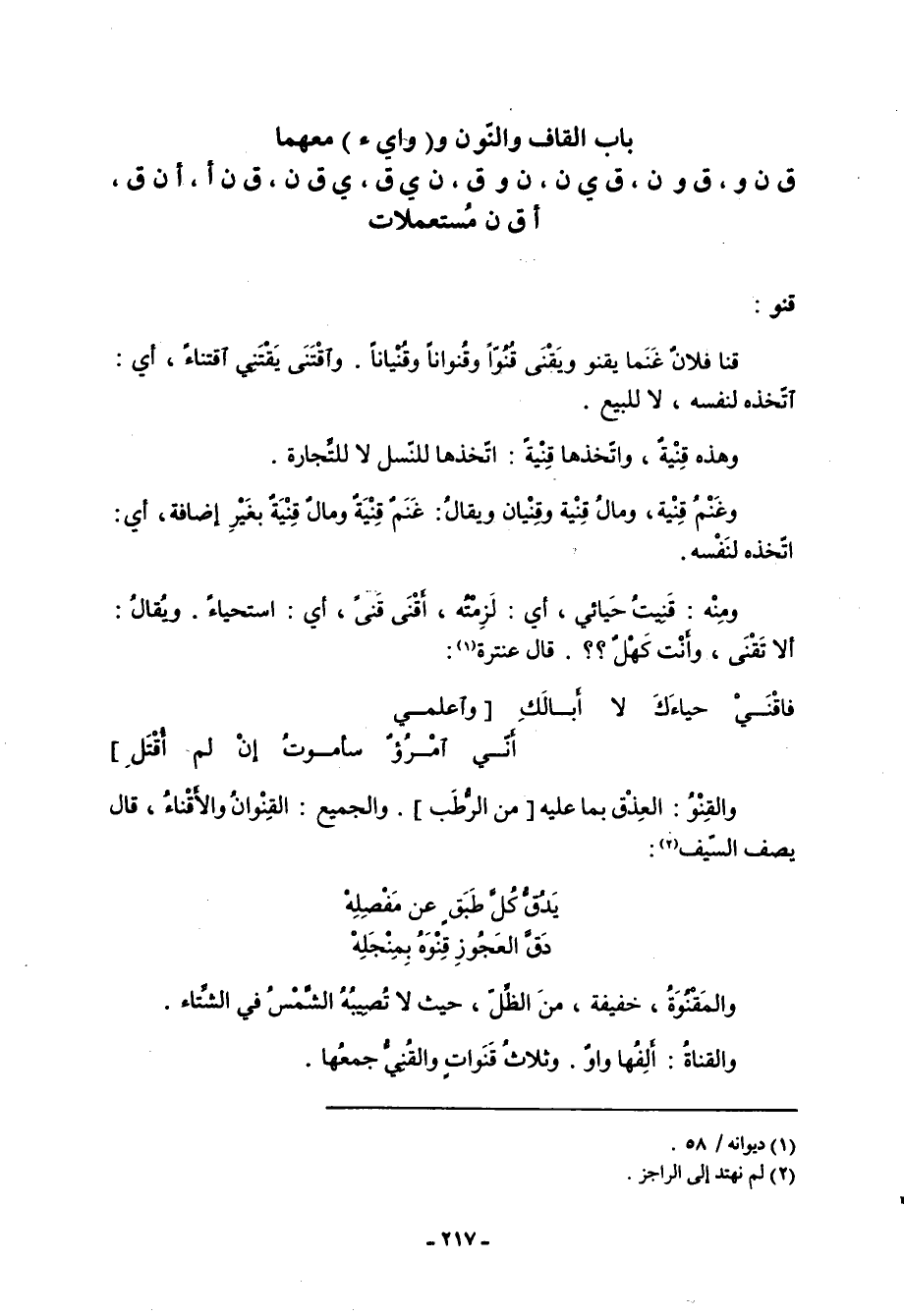 قنو: قنا فلان غنما يقنو ويَقْنَى قُنُوّاً وقُنواناً وقُنْياناً. واقْتَنَى يَقْتَنِي اقتناءً، أي: اتخذه لنفسه، لا للبيع. وهذه قِنْيةٌ، واتخذها قِنْيةً: اتخذها للنسل لا للتجارة. وغنم قِنْية، ومال قِنْية وقِنْيان ويقال: غنم قِنْيَةٌ ومال قِنْيَةٌ بغير إضافة، أي: اتخذه لنفسه. ومنه: قَنِيتُ حيائي، أي: لزمته، أَقْنَى قَنىً، أي: استحياء. ويقال: ألا تَقْنَى، وأنت كهل؟؟. قال عنترة «1» :