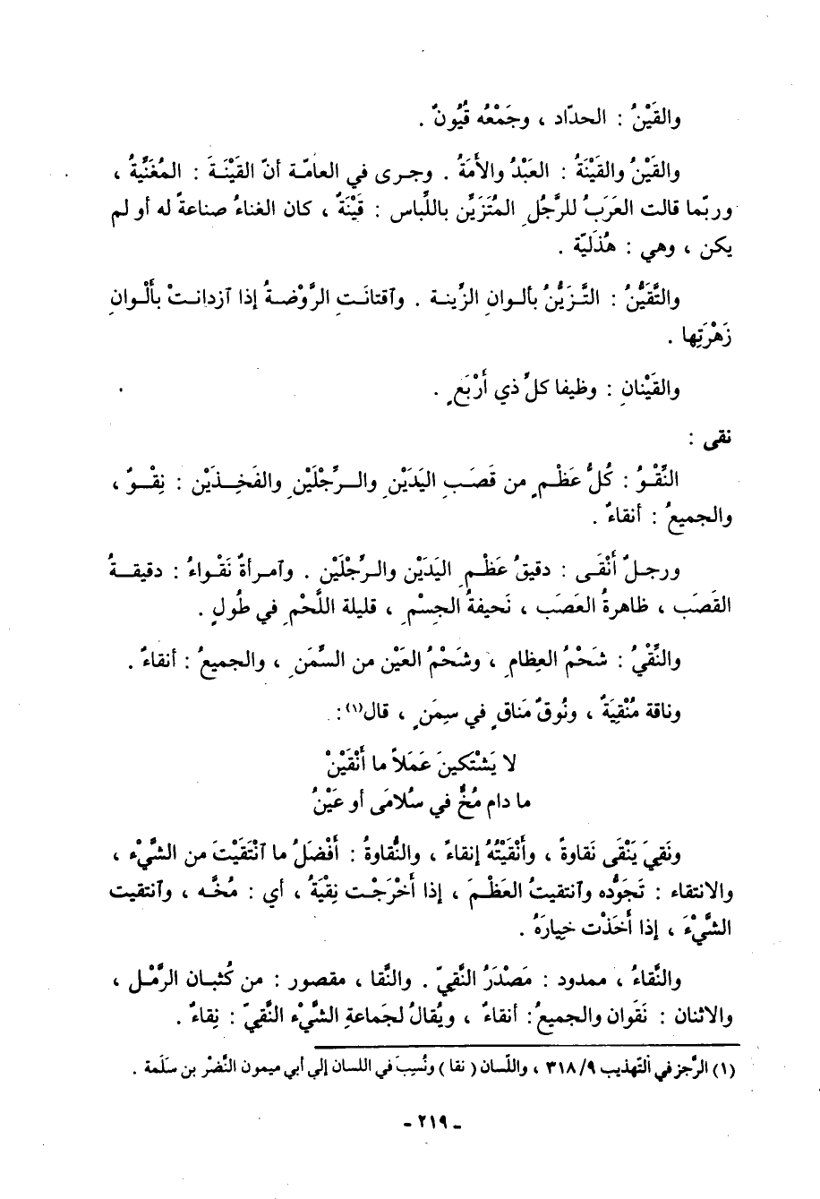 نقى: النَّقْوُ: كل عظم من قصب اليدين والرجلين والفخذين: نِقْوٌ، والجميع: أنقاءٌ. ورجل أَنْقَى: دقيق عظم اليدين والرجلين. وامرأة نَقْواءُ: دقيقة القصب، ظاهرة العصب، نحيفة الجسم، قليلة اللحم في طول. والنِّقْيُ: شحم العظام، وشحم العين من السمن، والجميع: أنقاءٌ. وناقة مُنْقِيَةٌ، ونوق مَناقٍ في سمن، قال «1» :